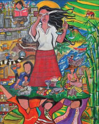 Das Bild stammt von einer 32-jährigen philippinischen Mutter, sie nennt ihr Bild „Ein füchtiger Blick auf die philippinische Situation“. Frauen und ihre Lebenswelten sind die bevorzugten Motive ihrer Malerei und sie hat hier die Gegensätze in vielen kleinen Szenen dargestellt. Über allem steht eine Frau im Zentrum des Bildes in rot/weiß gekleidet mit dem Gerechtigkeitssymbol in der Hand.