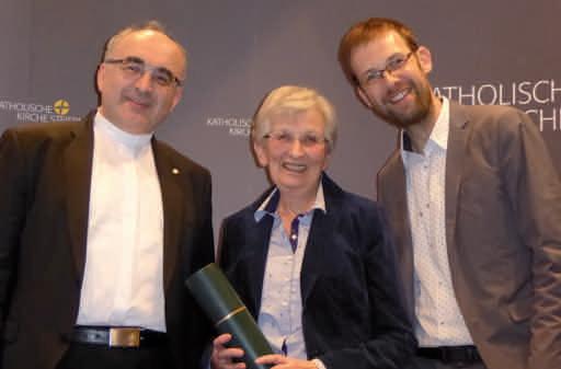 Bischof Wilhelm Krautwaschl und Helmut Schmidt überreichen die Urkunde an Irmgard Weirer