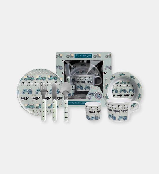 From left to right On The Farm Childrens Melamine Set £31 | On The Farm Kids Backpack £34 | Grey Sheep Blanket £36