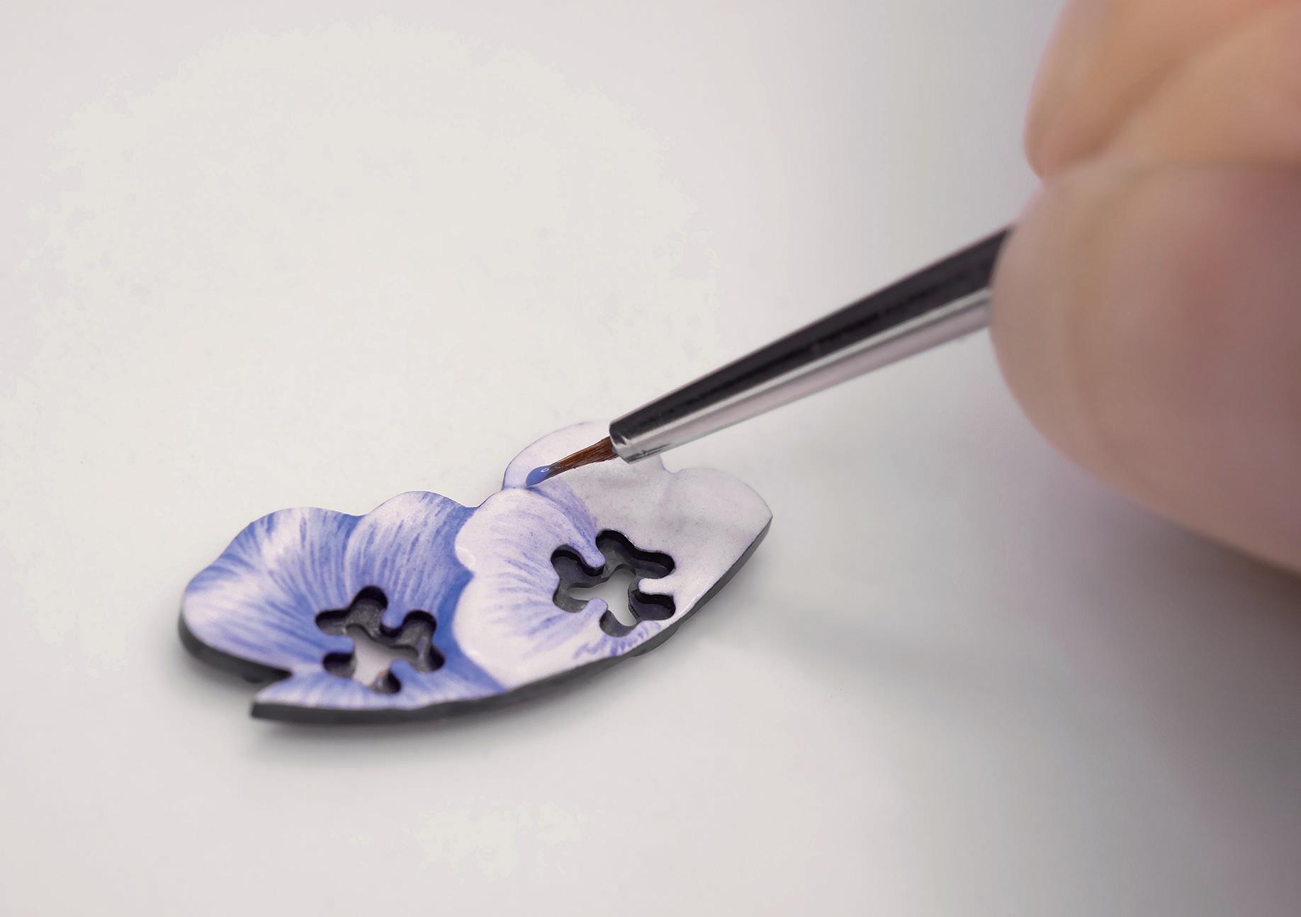 This rare craft was popular on watches in the 17th century and was particularly prominent in Geneva. Van Cleef & Arpels has been instrumental in reviving this technique. The process involves using a fine brush to apply layers of colour, often starting with the darker tones and gradually building up to the lighter shades, with each colour requiring a specific firing temperature.