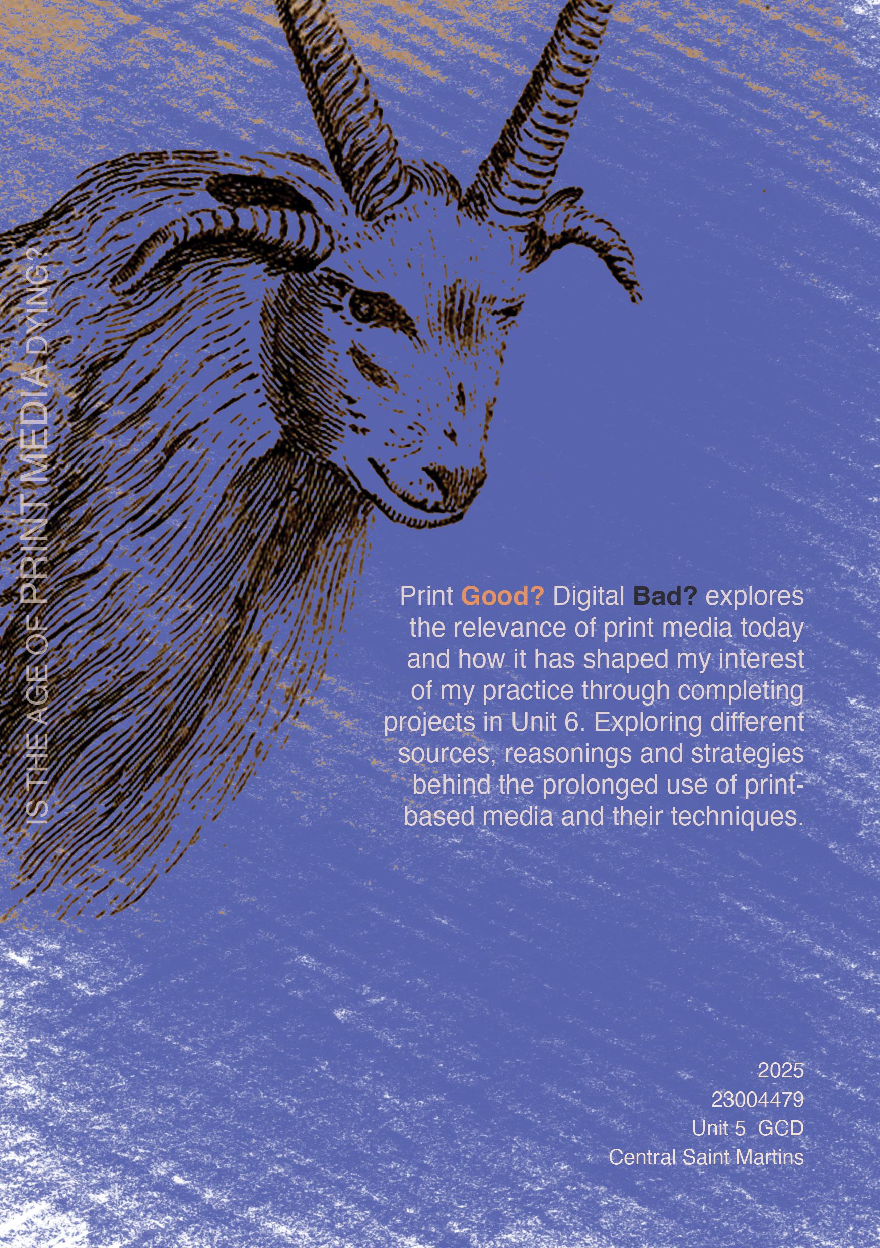 Digital, Bad? Print, Good? explores the relevance of print media today and how it has shaped my interest of my practice through completing projects in Unit 6. Exploring different sources, reasonings and strategies behind the prolonged use of print-based media and their techniques.