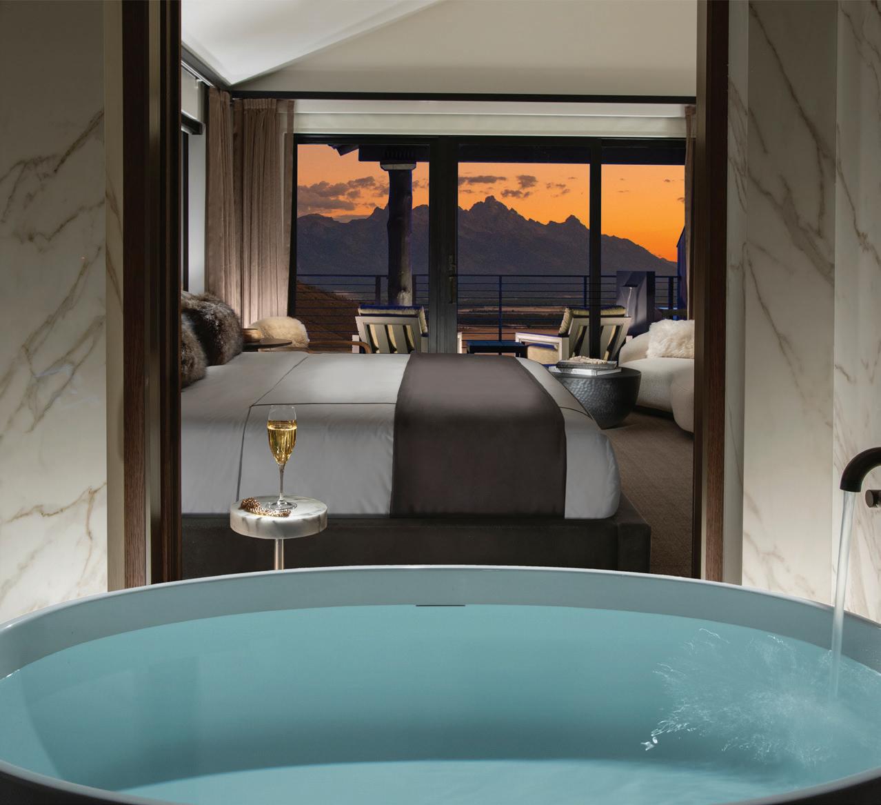 Occupying the coveted crest of East Gros Ventre Butte with next-door neighbor Amangani (currently closed for renovations), the adults-only Hotel Yellowstone, which opened in August 2024, transformed an existing property from rustic to mountain
