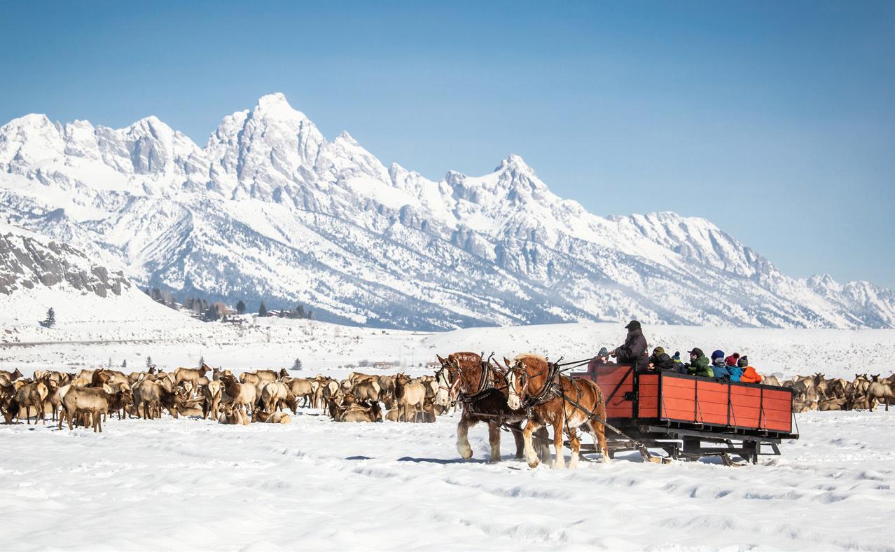 A premier destination for powder enthusiasts, averaging 459 inches of snow each season, Jackson Hole Mountain Resort serves up some of the most challenging terrain in the West, including iconic runs like Corbet's Couloir, a double-black diamond. Nearby, the National Elk Refuge (fws.gov/refuge/national-elk) offers sleigh rides around the herd, North America's largest, with winter populations typically ranging from 6,000 to over 10,000 head. In warmer months, the resort’s Aerial Tram, which ascends 4,139 feet to an elevation of 10,450 feet in just 12 minutes, offers access to a vast trail network that links Jackson Hole Mountain Resort, Bridger-Teton National Forest and Grand Teton National Park.
