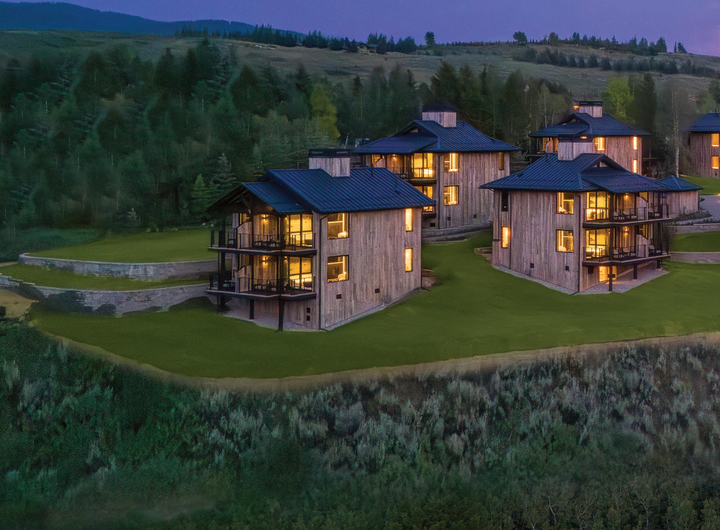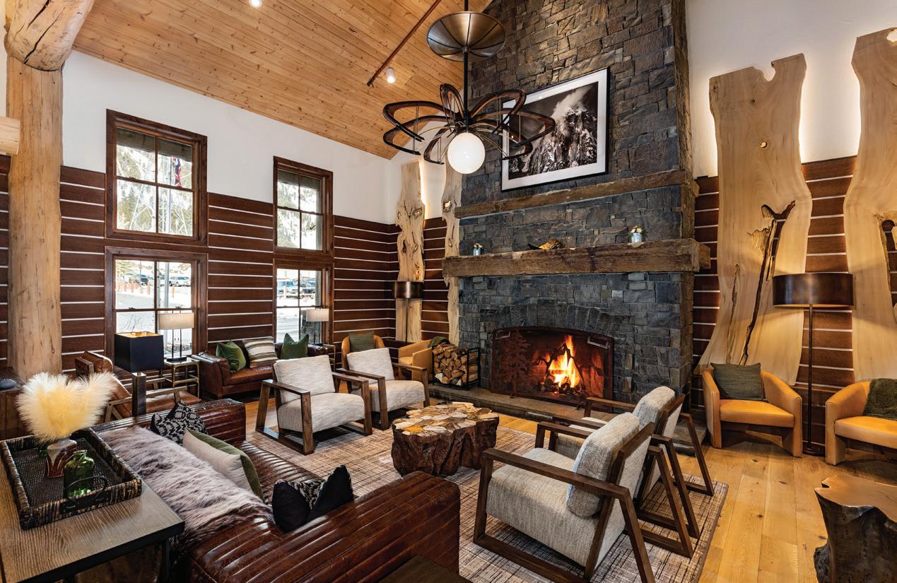 Rugged natural materials such as dark wood, timber beams, and large stone-faced fireplaces, which anchor multiple cozy seating areas with plush couches and throw blankets, are juxtaposed with custom chandeliers, blackened steel, and antique brass accents, and expansive windows that frame the natural beauty of the surrounding mountain landscape. The rustic alpine-style design continues in the guestrooms ranging in size from 350 to 1,580 square feet. Common among them is a stone-faced gas fireplace and built-in boot dryer, and most boast a fully equipped kitchen with a separate dining area. Spacious bathrooms offer a jetted tub or a double-headed rain shower.