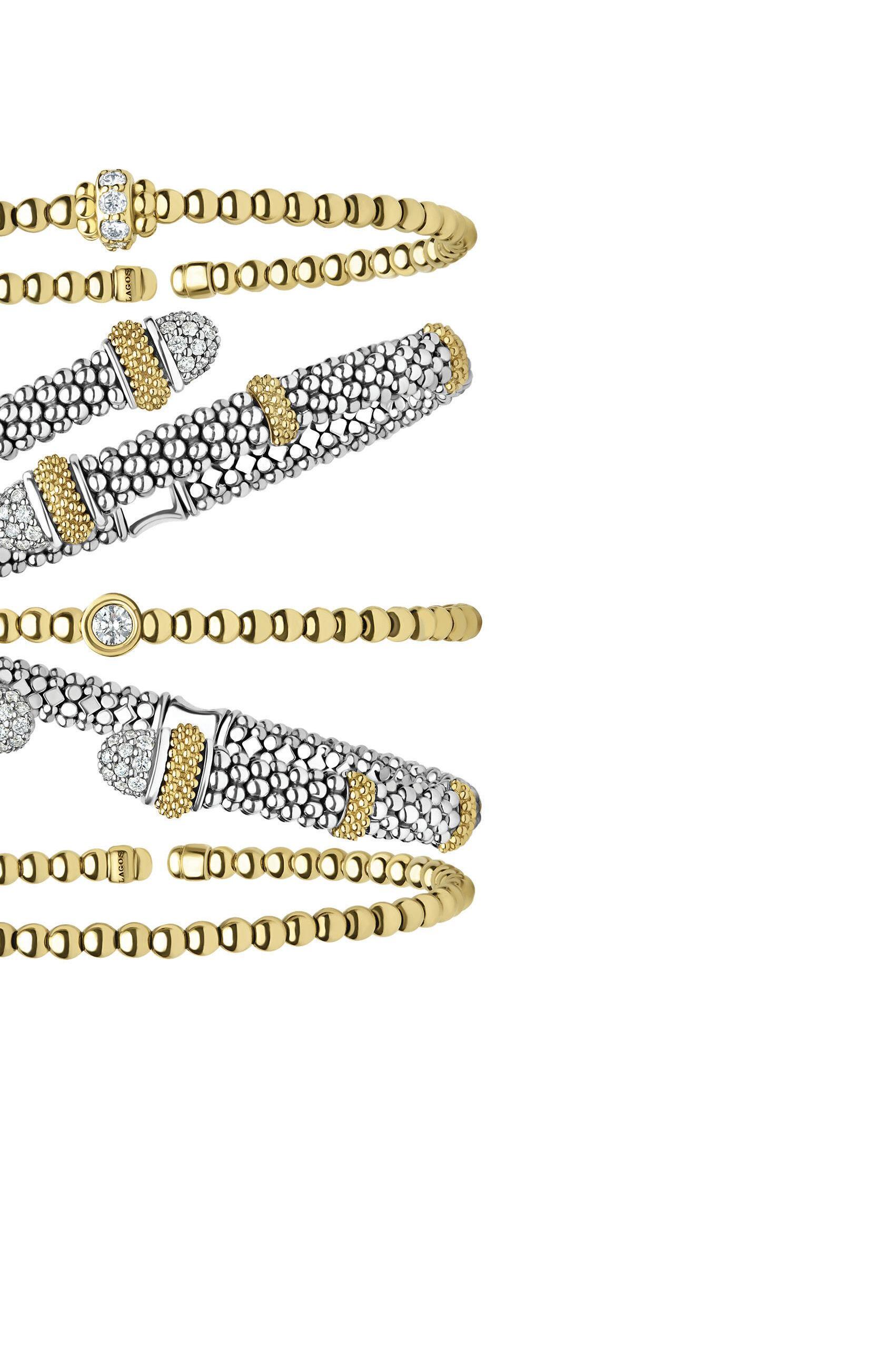 LAGOS, left to right: 18K Gold Caviar Beaded Cuff Bracelet, 3mm; Caviar Lux Diamond Versa Torque Bracelet, 5mm; 18K Gold Caviar Beaded Diamond Cuff Bracelet, 3mm; Two-Tone Caviar Diamond Versa Bypass Bracelet, 5mm; 18K Gold Caviar Beaded Diamond Rondelle Cuff Bracelet, 3mm