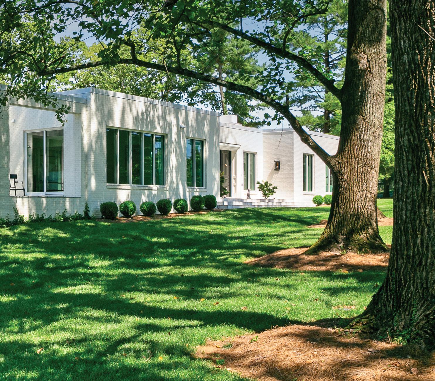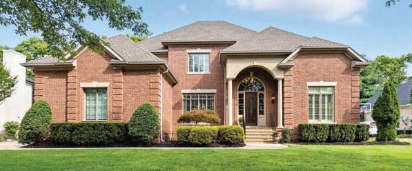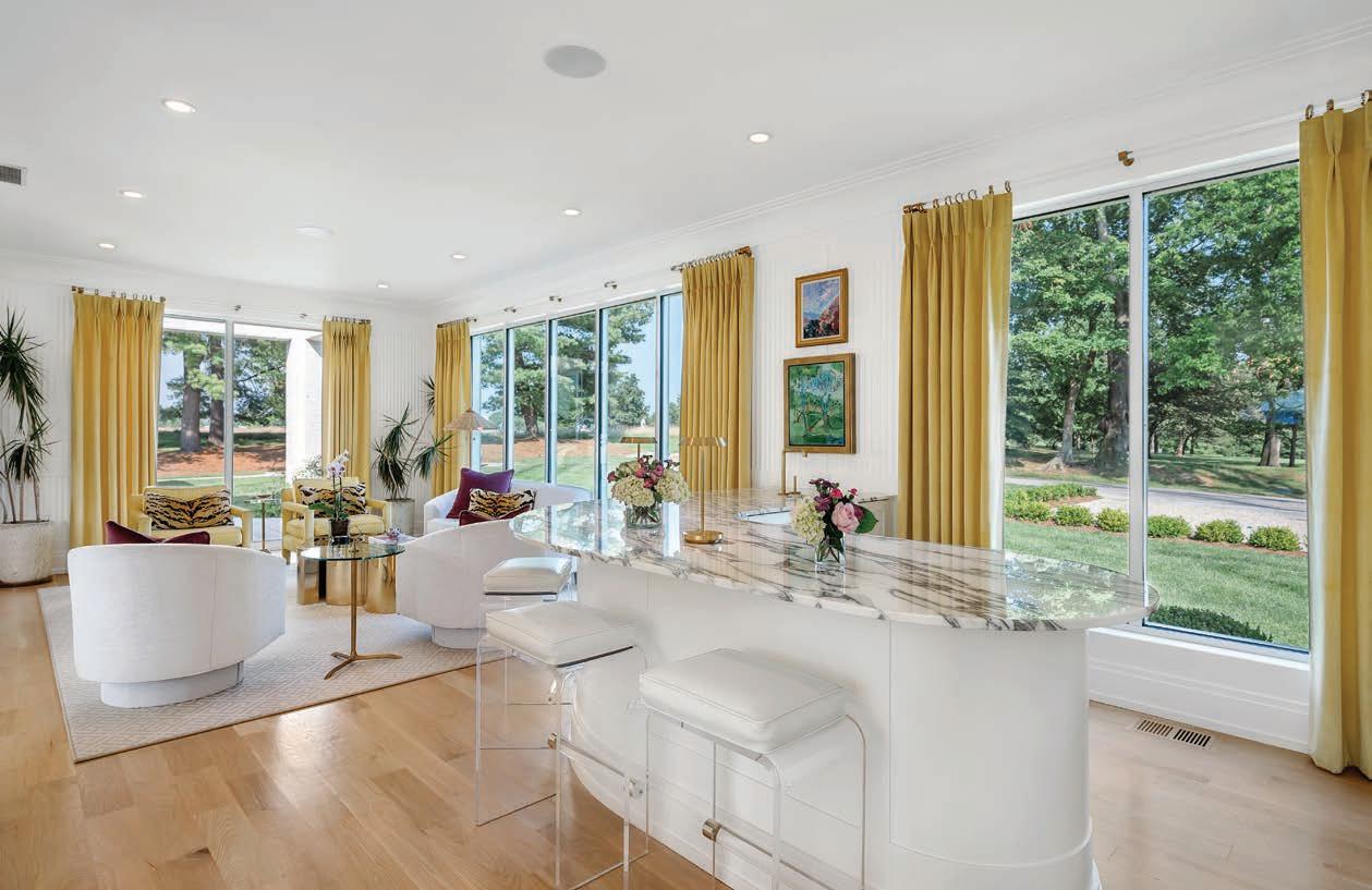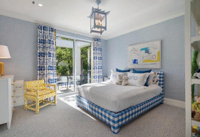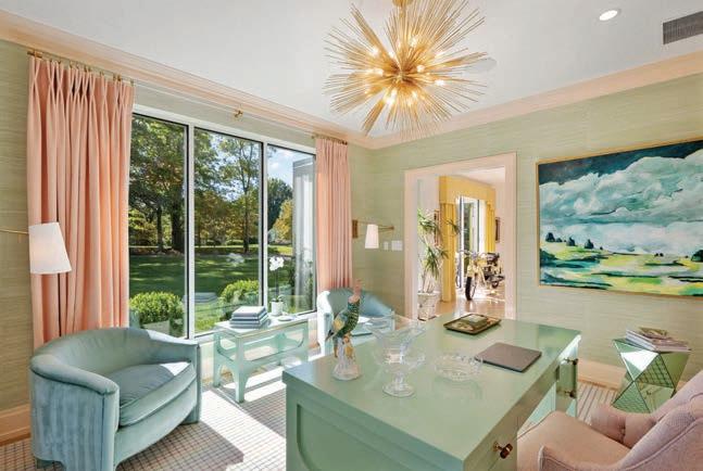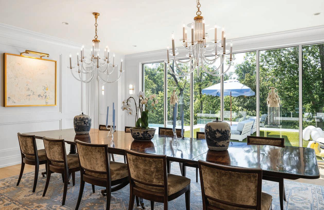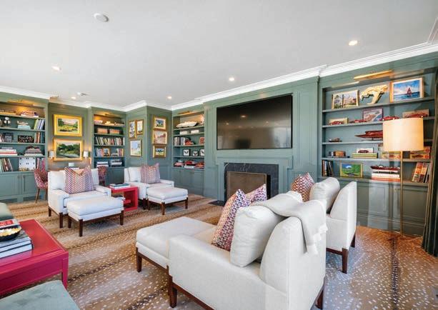 A 40-foot skylight crowns the corridor leading to the home's five bedrooms. At the end is a taxidermy giraffe that Lindsay said was procured from Louisville's Fleur de Flea after ladies from her running group spied it and sent her a photograph. The tranquil primary suite seems to float amid the trees courtesy of floor-toceiling windows on two sides. There are uniquely designed his and her closets, with hers being a fashionista's dream, and a spalike bath whose oval floating vanities mimic the contours of the centrally positioned soaking tub.