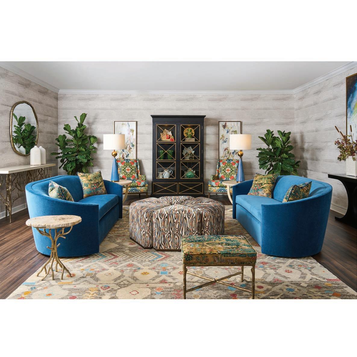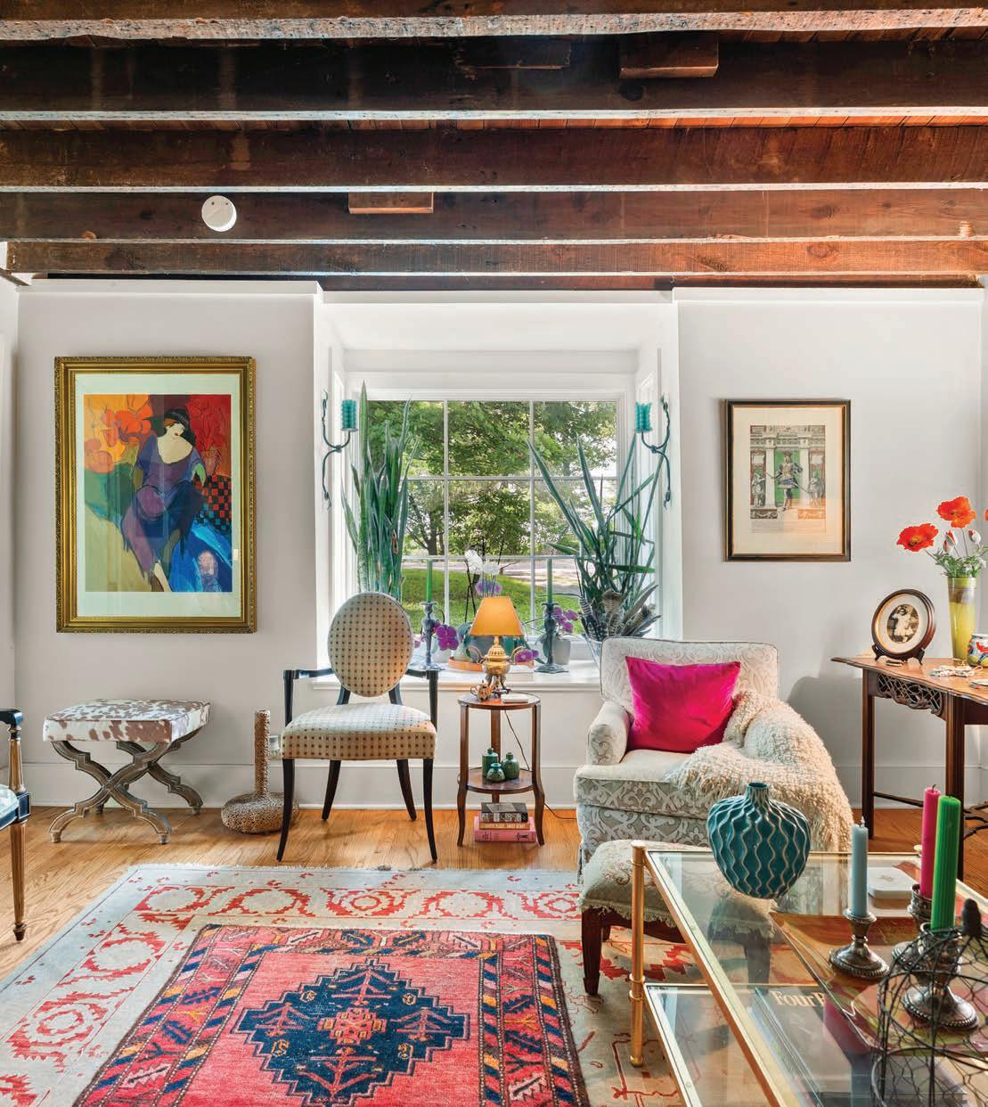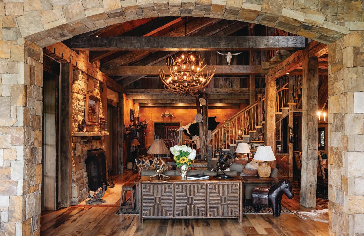 "Before I brought Libby on board, I was literally flying by the seat of my pants," said the homeowner in a 2012 Sophisticated Living story. The original modest barn-style home was designed by architect Craig Rushing of RC3 in Lexington. As the original footprint has expanded with the addition of a new primary bedroom wing and, most recently, a kitchen extension, the rustic interiors remain characterized using varied reclaimed woods, stone, and leather, and are complemented by the rich colors and textures of the American West.