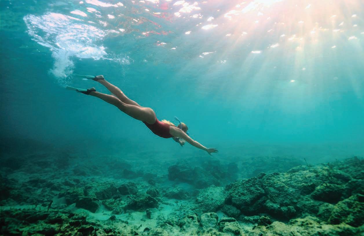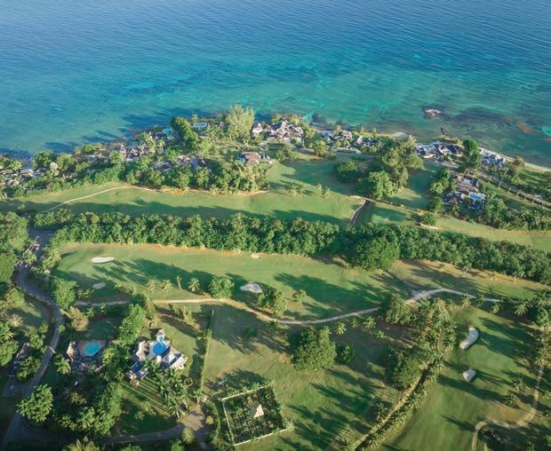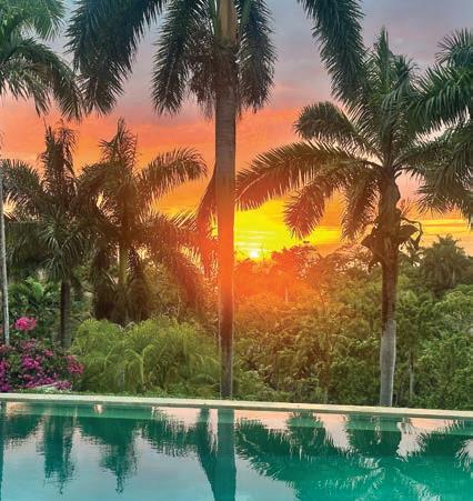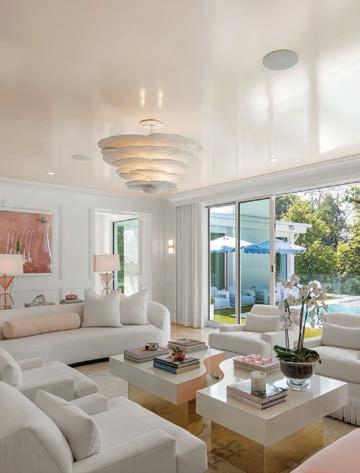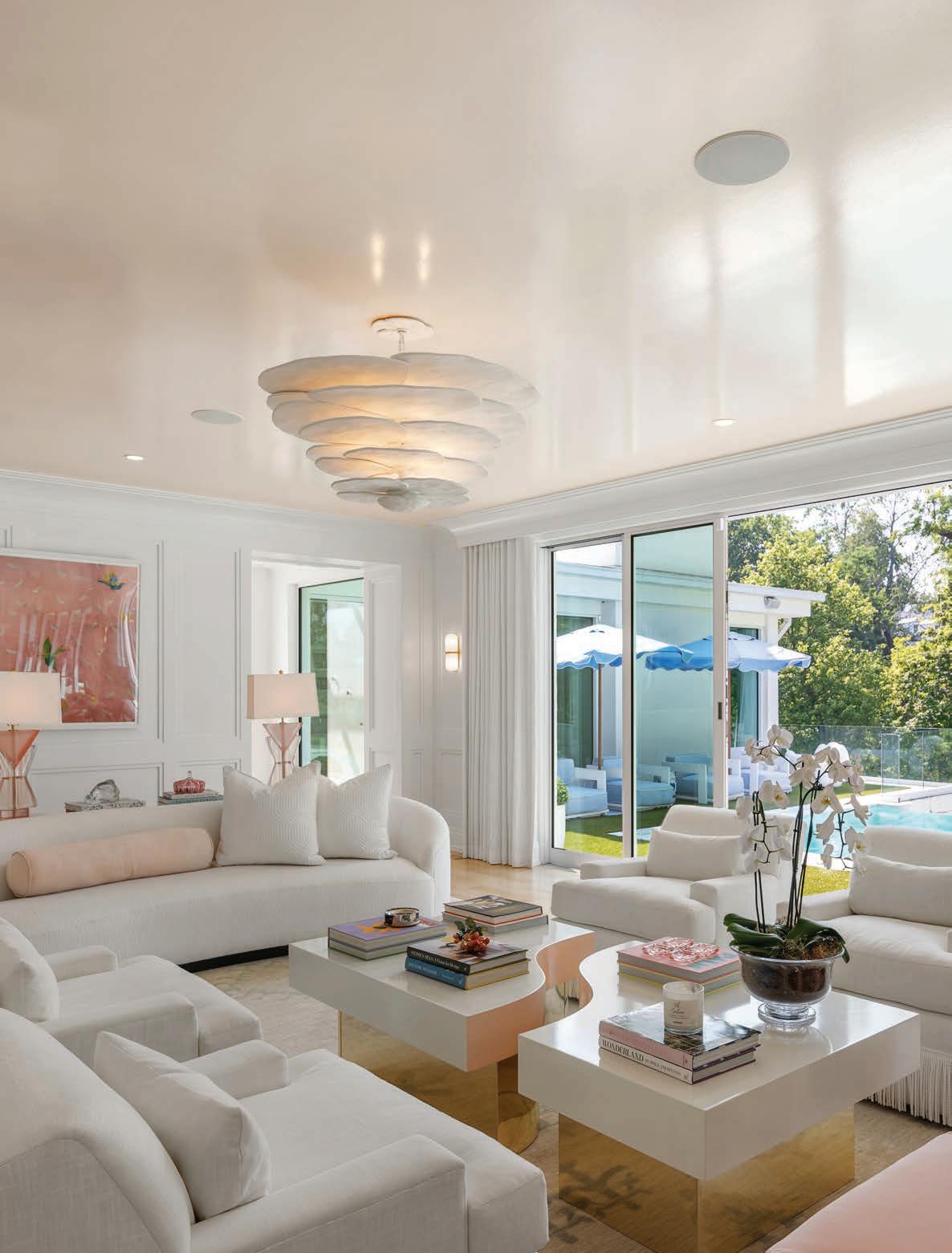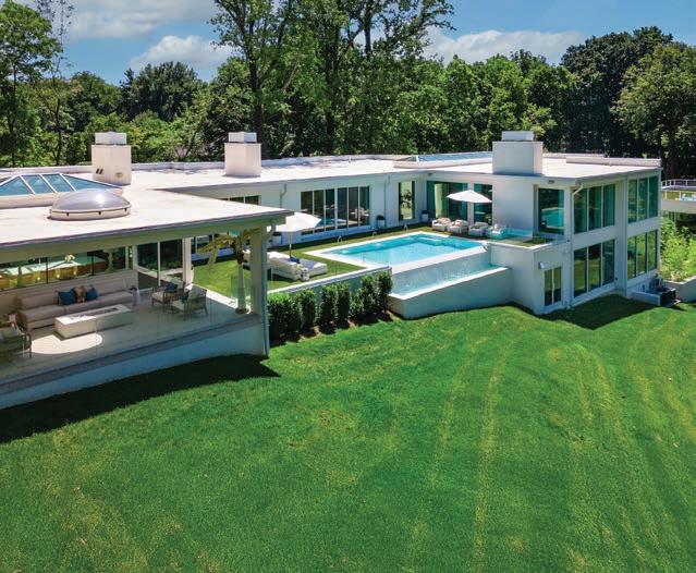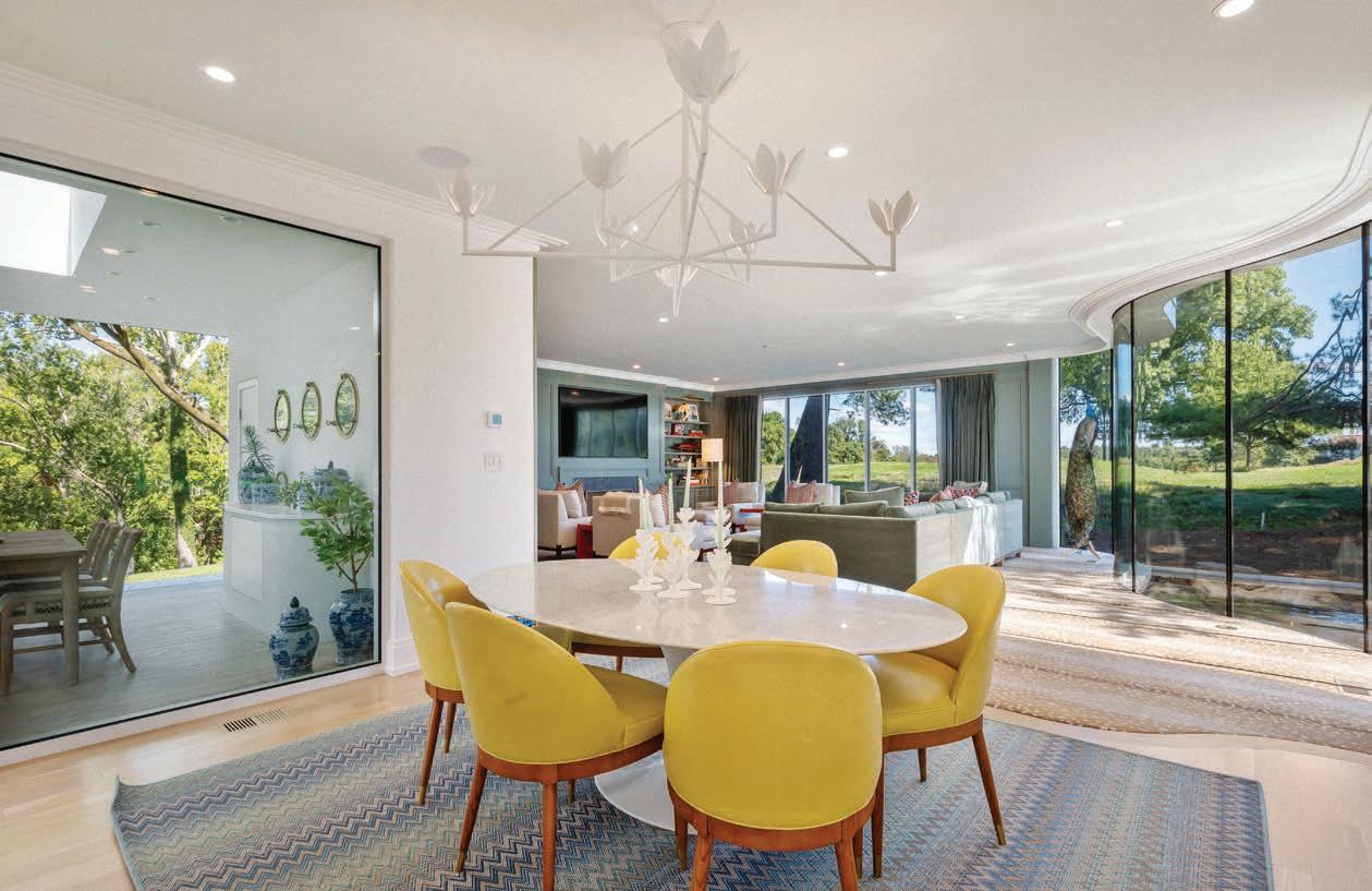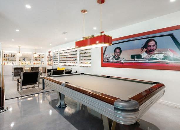 Sightlines and sunlight are carefully considered throughout, with walls of glass highlighting views of the infinity pool and golf course at the rear of the home. Skylights drench the kitchen and corridor leading to the bedrooms with natural light. A curved floorto-ceiling structural glass wall in the sprawling family room is an engineering marvel in a space full of superlatives. Adding to the intrigue are square pavers that seem to float atop a koi pond, whose waterline meets the window.