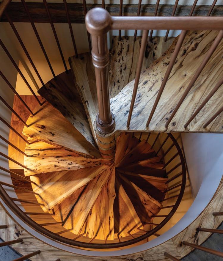The kitchen addition made it possible to add a partial basement. The space, a preferred hangout for visiting grandchildren, nieces, and nephews, is accessed via a stunning spiral staircase with live-edge treads created by Phil and Steve Lafollette of Dreamers Studio that are affixed to a metal frame with an interesting faux bois finish.