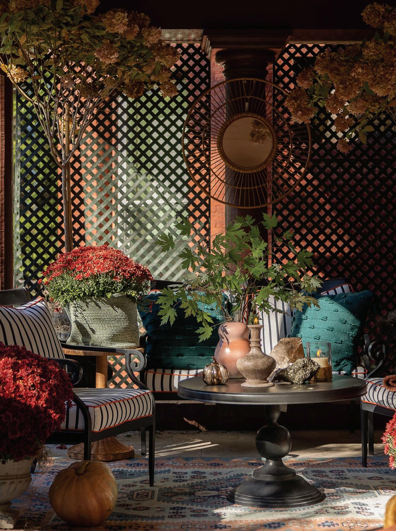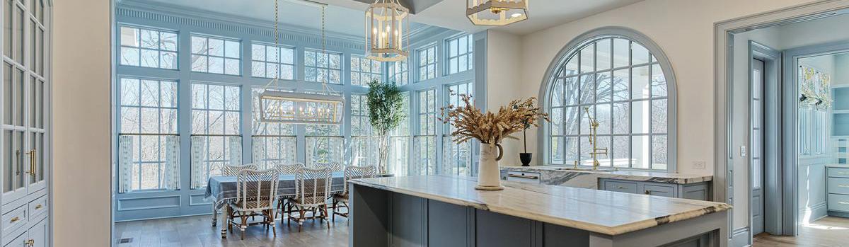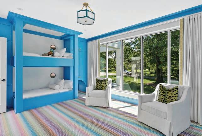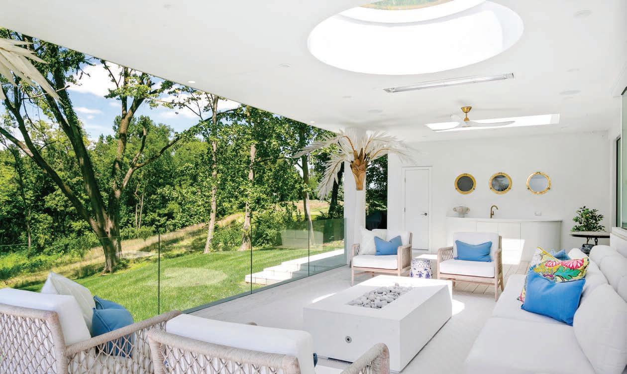 The kitchen opens to a covered terrace with a mid-centuryinspired dome-shaped skylight. Television screens mounted behind a trio of portholes installed along one wall play a looping video of undulating waves. Fitz said he spied something similar at the Chatham Bars Inn in Massachusetts and was thrilled when his persistence was rewarded by getting them to share the exact video. Equally shipshape is a butler's pantry between the kitchen and dining room, whose fine cabinetry would be apropos for the finest superyacht.