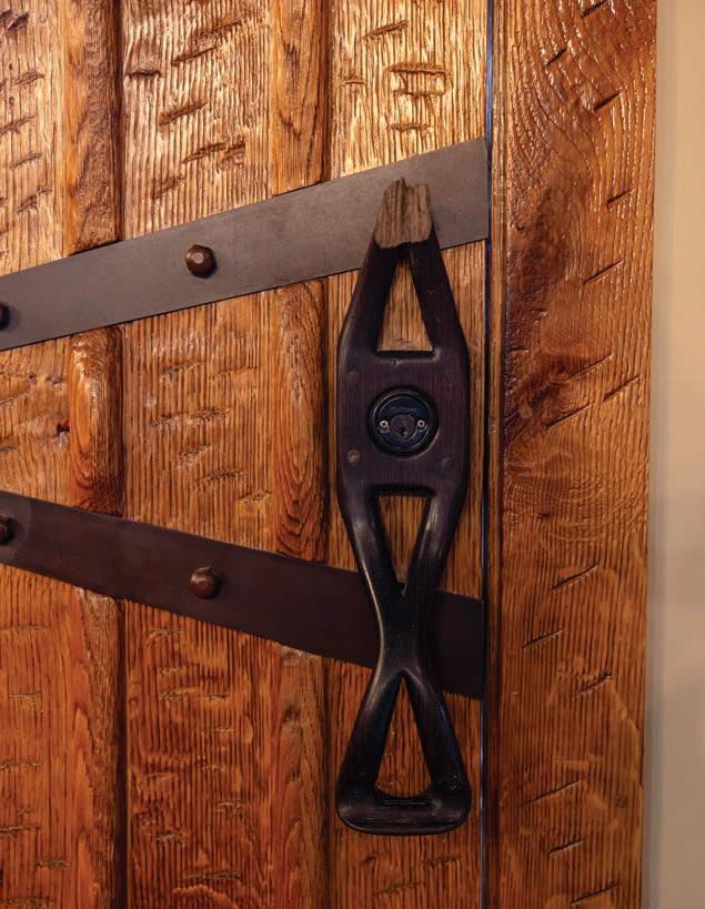 Consistent over the years of renovations and redesigns is that nothing about this home is cookie-cutter. "It has been so fun getting to run with this theme," remarked Rush. A beautiful live edge bar top salvaged from the old kitchen was repurposed by the Bittners' woodworking shop into a custom credenza separating the space from the living room. Nearby, iron straps provide a focal point for bespoke closet doors, also crafted by Bittners.