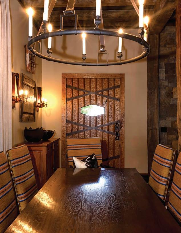 A secondary dining area in the former kitchen space is defined by chairs with tooled leather seats, reminiscent of a fine Western saddle and a custom cowhide patchwork rug. As part of the most recent renovations, several upholstered pieces in the living area were refreshed, and a new custom rug from Anabel's was selected to anchor the seating area in front of the fireplace.
