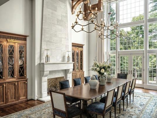 Situated on a 3-acre lot in Huntleigh, Missouri, this mountain home takes full advantage of its natural setting. Our design team carefully studied the property’s existing features — including a serene pond and gently sloping hill — to determine the optimal orientation. This thoughtful positioning not only ensures privacy from neighboring properties but also creates carefully framed views of the surrounding landscape. One of our primary challenges was maintaining the authentic character of mountain homes while incorporating abundant natural light. The solution? Strategic window placement and architectural details that respect the rustic home’s interior aesthetic while transforming its interior spaces. By incorporating elevated ceilings throughout, we were able to install dormer windows high on the walls, allowing natural light to cascade down into the living spaces below. The home’s design radiates from a central core comprising the kitchen, dining area and family room — spaces that foster connection and daily living. Guests are welcomed by a dramatic entry foyer featuring a large masonry see-through fireplace and an elegant groin vaulted ceiling, setting the tone for the sophisticated yet warm atmosphere that pervades this mountain rustic house. Throughout the 7,000 square feet of living space, our team incorporated numerous distinctive features that elevate the home beyond the ordinary. Five bedrooms and six full bathrooms, plus three half baths, ensure ample space for family and guests. The music room, complete with its own fireplace, provides an intimate setting for entertainment while a dedicated wine room adds a touch of sophistication to the home’s interior. This mountain rustic home stands as proof that natural beauty and modern comfort can coexist in perfect harmony.