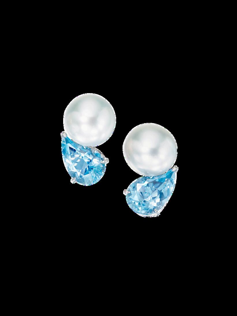 Aquamarine is March’s birthstone. Assael Paisley South Sea pearl and aquamarine earrings (assael.com)