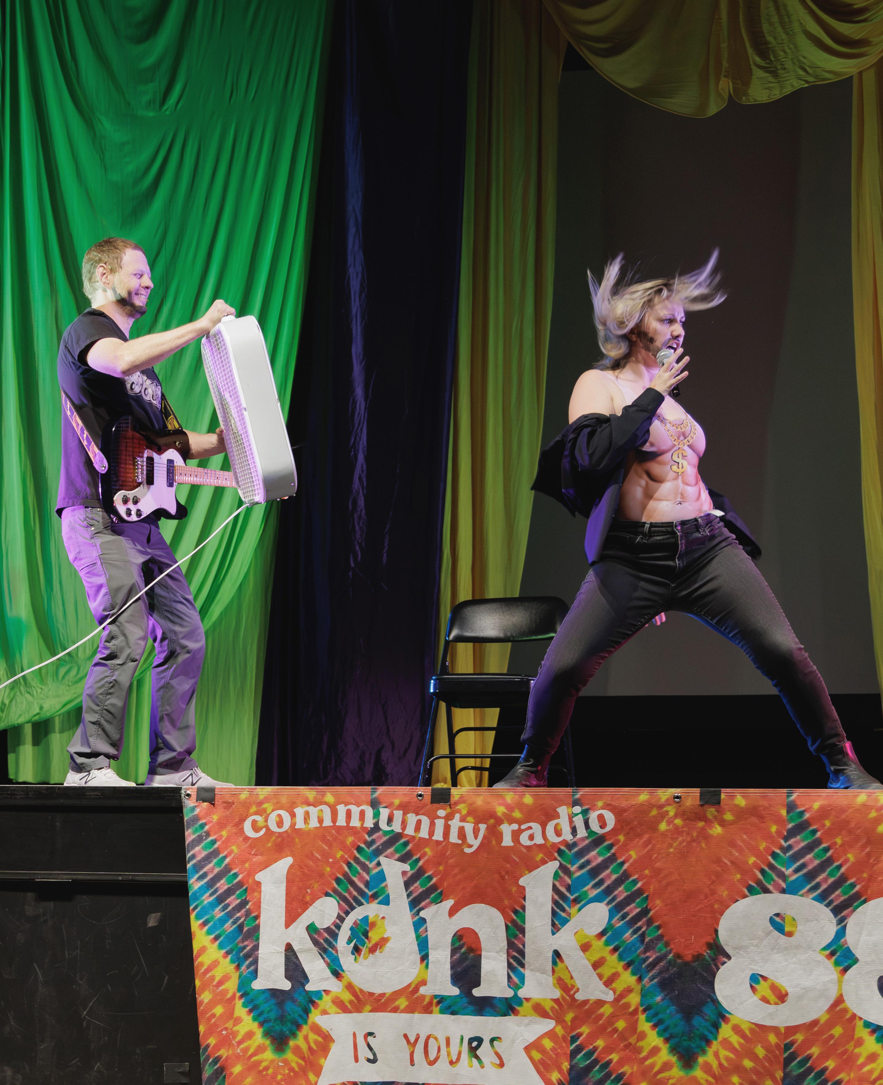 Local power couple Marc and Sara McMillan walked away with the gold after their performance of “With Arms Wide Open” by Creed at KDNK Community Access Radio’s Lip Sync Battle, hosted by the Roaring Divas on Saturday, April 18 in the Community Hall of the Third Street Center. Team “Brady Pimp & the Aerialists,” featuring lead dancer Nathaly Camacho, took second for their choreographed rendition of Fergie’s “Fergalicious,” and “Arnie Jacobs” (Caitlin Evans) placed third, performing “Splish Splash” by