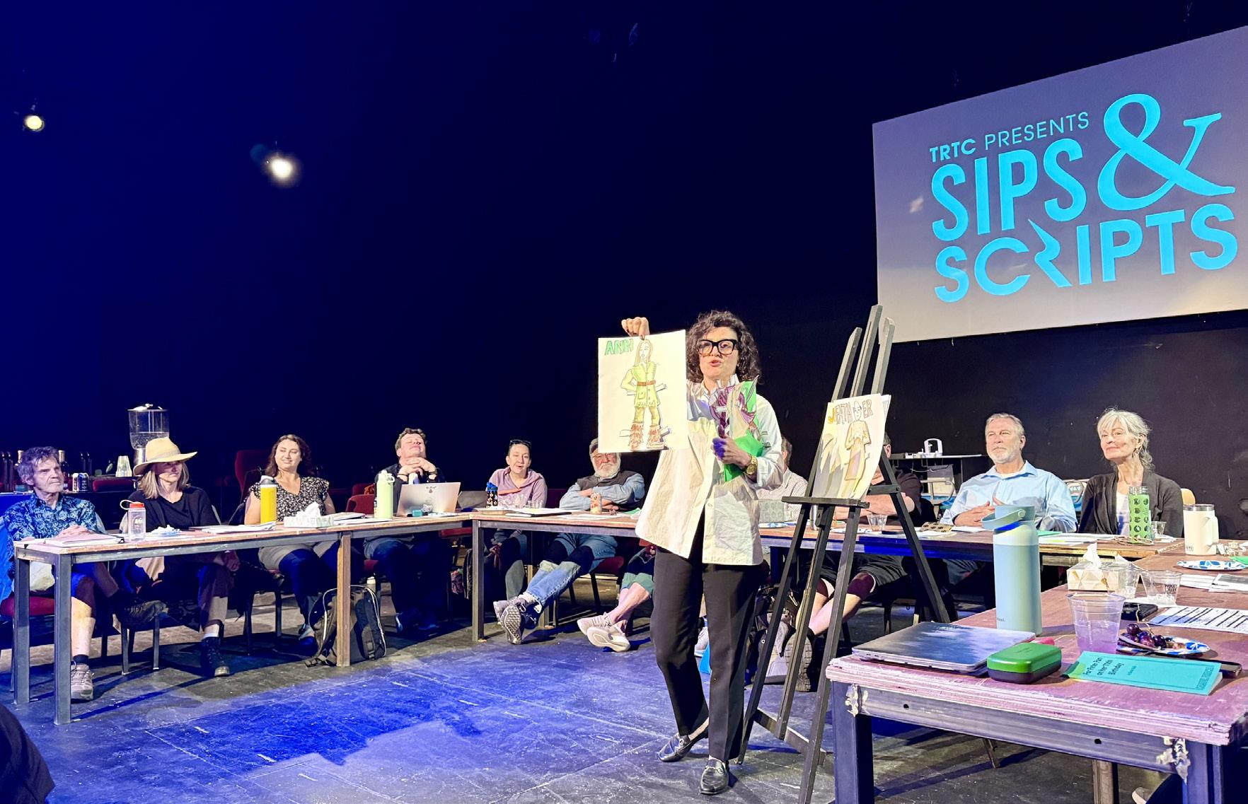 Sara Malloy, costume designer, runs through her designs for a small audience of aficionados at an early readthrough of “For Peter Pan on her 70th Birthday,” to be performed at the Thunder River Theatre May 1 to 17.