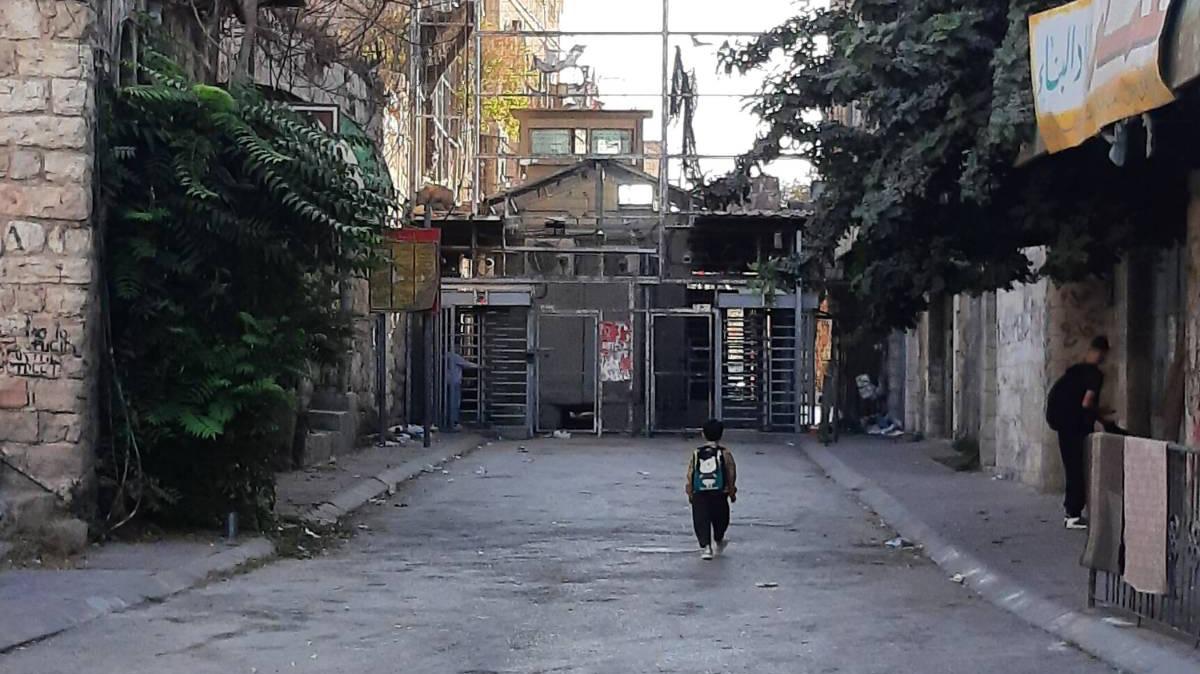 A young child heads to school through Checkpoint 56 in occupied Al-Khali (Hebron).