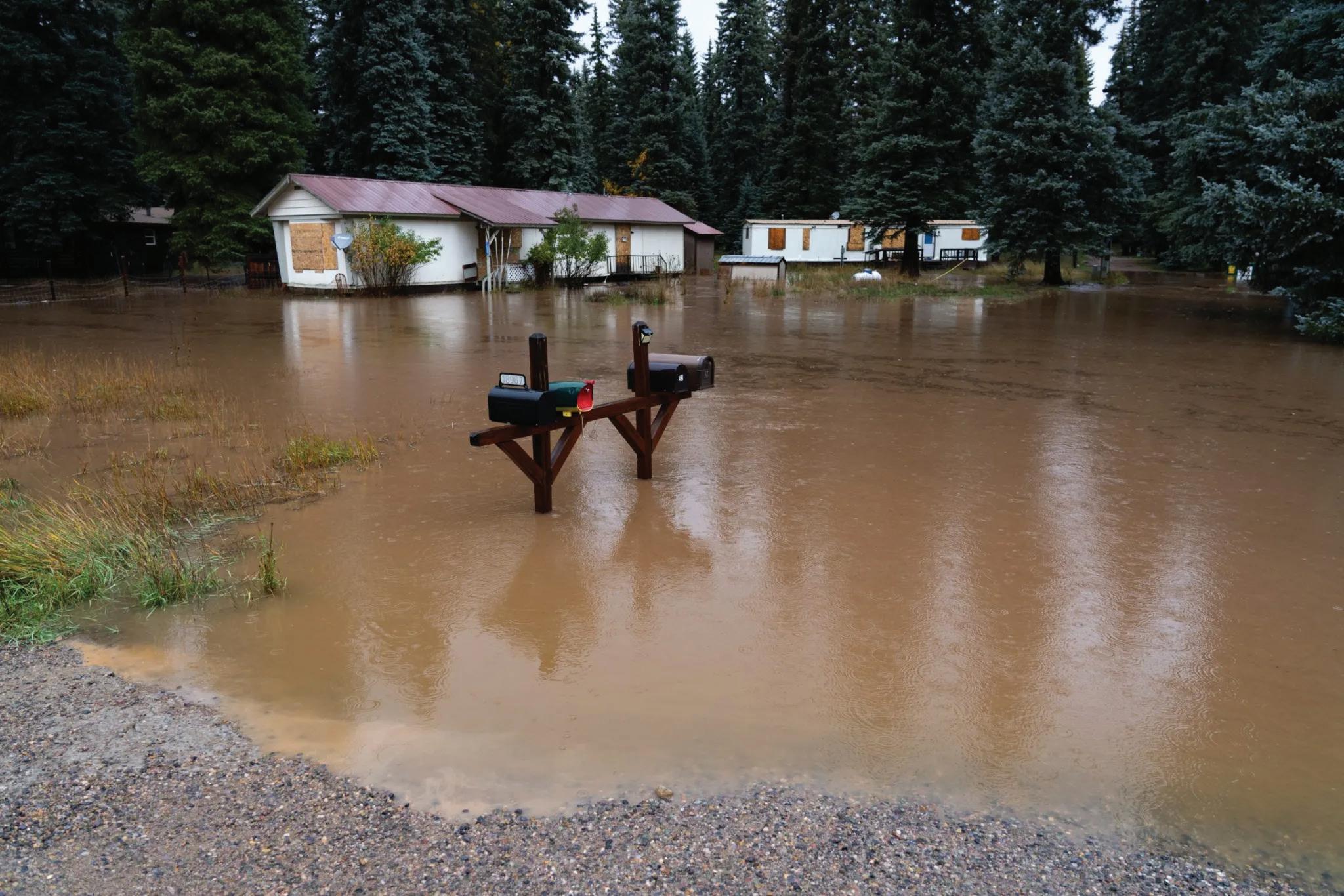 Las aguas de la inundación se acercaron a las casas tapiadas a lo largo de la carretera del condado 501 en la tarde del sábado 11 de octubre de 2025 en Vallecito, Colorado. El Distrito de Protección contra Incendios de Upper Pine reportó 11 rescates en aguas altas ese sábado, uno de los cuales fue una familia que no evacuó cuando se emitió la alerta y necesitó ayuda cuando el agua, desbordada del normalmente tranquilo arroyo Vallecito, comenzó a subir. Foto por Jeremy Wade Shockley para The Colorado Sun