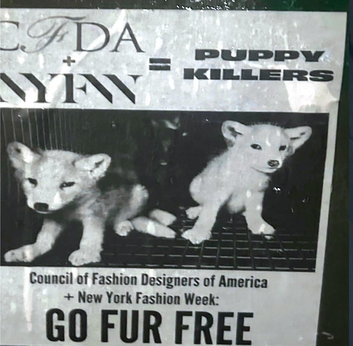 On my way to the financial district I came across a poster that quickly grasped my attention: “CFDA [Council of Fashion Designers of America] + NYFW [New york fashion week] = puppy killers. GO FUR FREE.”