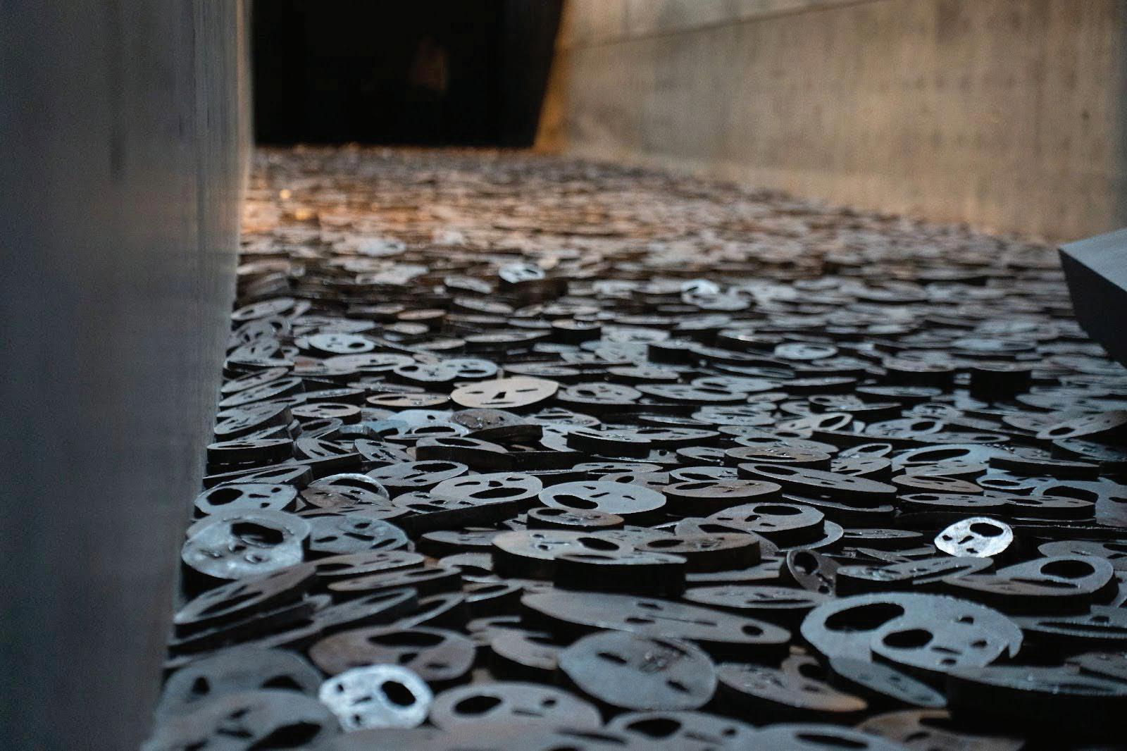 A photo of "Fallen Leaves,” an installation by Menashe Kadishman made up of roughly 10,000 face cut-outs made from thick steel plates meant to represent the Jewish victims of the Holocaust. Visitors are encouraged to walk across and back while looking down.