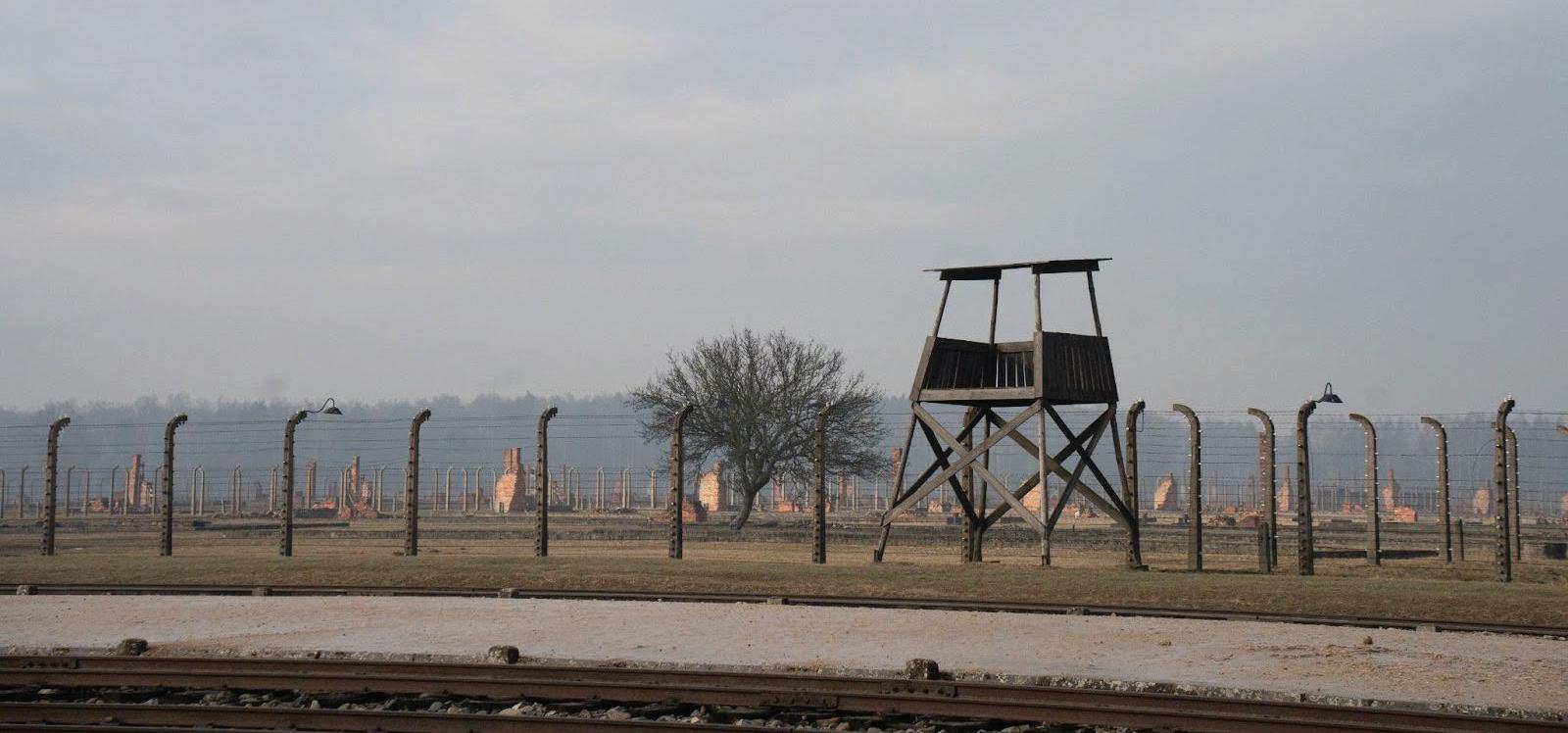 Auschwitz-Birkenau as seen from the train tracks. The watch tower was used for security monitoring. In the background are hundreds of brick chimneys, each one belonging to a different barrack. The chimneys are the only thing standing because the barracks in this section were made out of wood planks. Only 10% of people brought here lived in this area, the rest were immediately sent to the gas chambers.