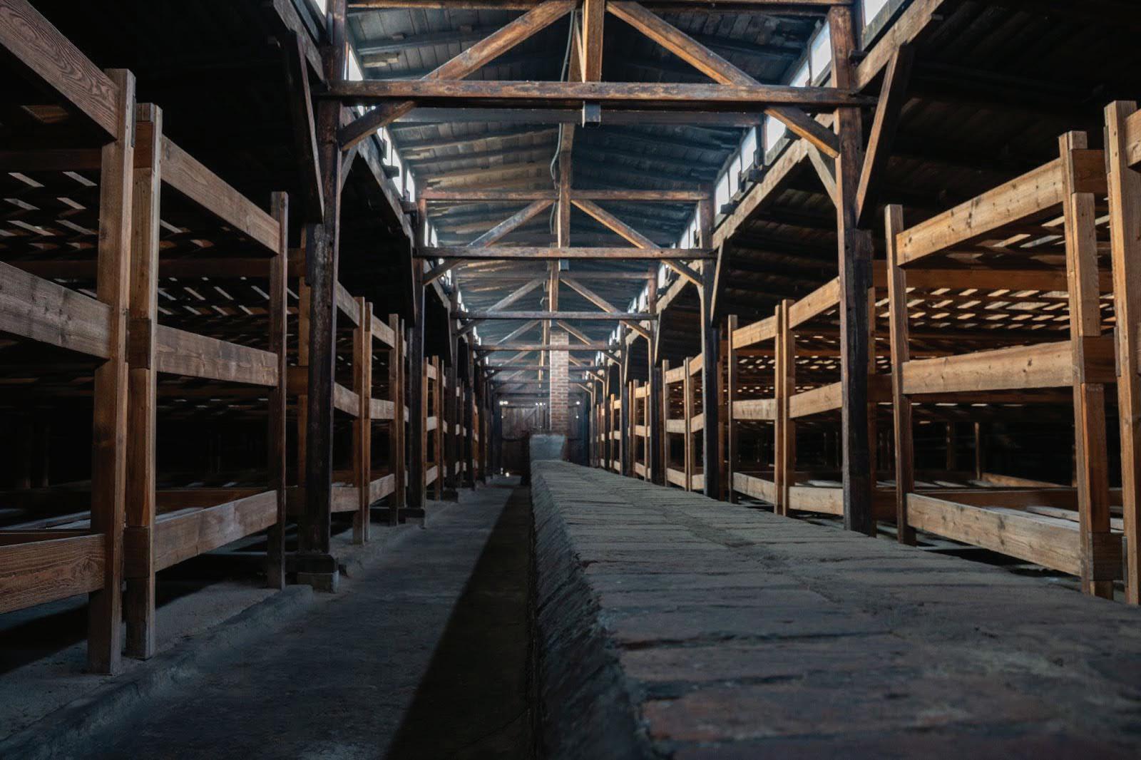 Inside a restored barrack at Auschwitz-Birkenau (Auschwitz II), each level of the three-tiered bunks held 10 people. Some barracks held over 1,000 at a time, with no bathrooms or sanitary facilities.