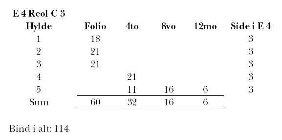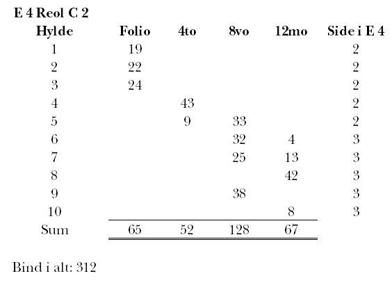 opstillet i de enkelte reoler efter størrelse med folianterne nederst, fulgt gradvist opefter af kvarterne, oktaverne og duodecimoerne, evt. med udeladelse af en af grupperne undervejs (dette kun umiddelbart konstaterbart for de latinske værkers vedkommende, da hverken de nyromanske eller de germanske værker normalt er forsynet med formatangivelse). Jvf. f.eks. at reol C ikke rummer nogen duodecimoer og at reol E ikke rummer nogen kvarter.