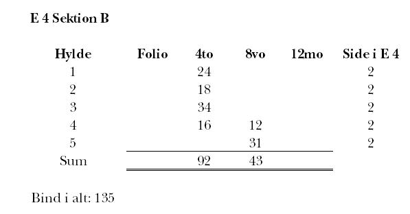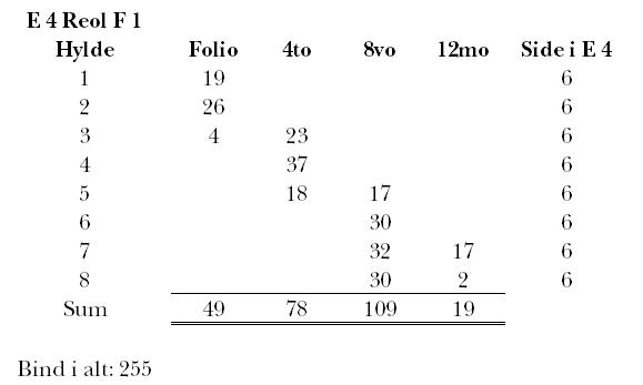 E 4’s tekst lyder: ”Infra fenestras quadrantibus IV. [d.e. quattuor] inferioribus positi sunt fol. 78. Quadrantibus IIbus [d.e. duobus] proximè super[iores] fol. 47. Quadrantibus IIbus [d.e. duobus] sequentibus fol. 47. VIII. 17. XII. 13.”, d.e. “Under vinduerne i de 4 nedre reoler [dvs. underreoler / lave reol[kass]er] er der placeret 78 foliant–bind. I de 2 reoler nærmest de foregående [er der placeret] 47 foliant–bind. I de to efterfølgende reoler [er der placeret] 47 bind in folio, 17 oktav–bind og 13 duodecimo–bind.”