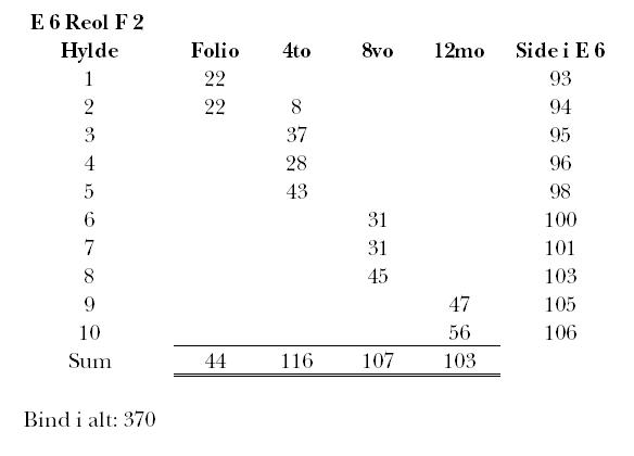 279 hylder, følgende skabelonen: ”tab[ula]”, d.e. ”på hylde” + hyldenummer (I … X) + bindformat (fol, IV, VIII, XII) + bindantal. Som indholdsangivelse er der ud for den første hylde (til højre) anført ”Medici”, d.e. ”Lægevidenskabelige værker”, ud for hylde 2–4, der er holdt i en gruppe for sig ved hjælp af en venstre krølleparentes, (til venstre) for hyldeopregningen er anført ”Politici” (og det vil her nærmest sige at værkerne på hylderne er statskundskabsrelaterede), og ud for hylderne 5–10 intet er anført af indholdsmæssig art (uagtet disse hylder ud fra indholdet af de i E 6 opregnede værker at dømme også synes udelukkende at indeholde statskundskabsrelaterede værker).