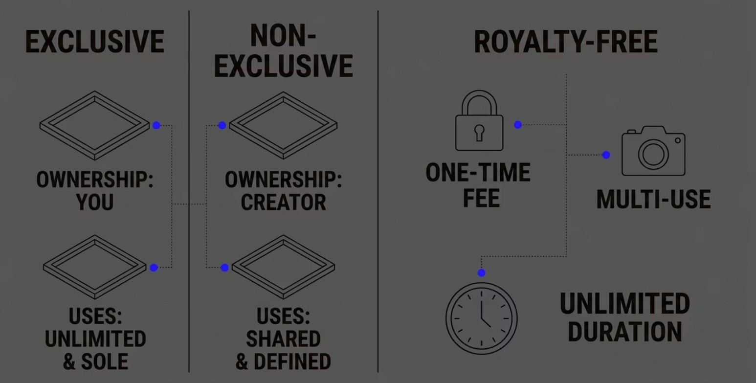• Exclusive License: Grants you sole rights to use the images for specified purposes and period. No one else, including the photographer, can use them during this time.