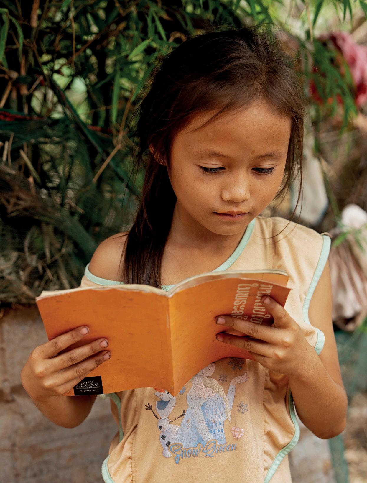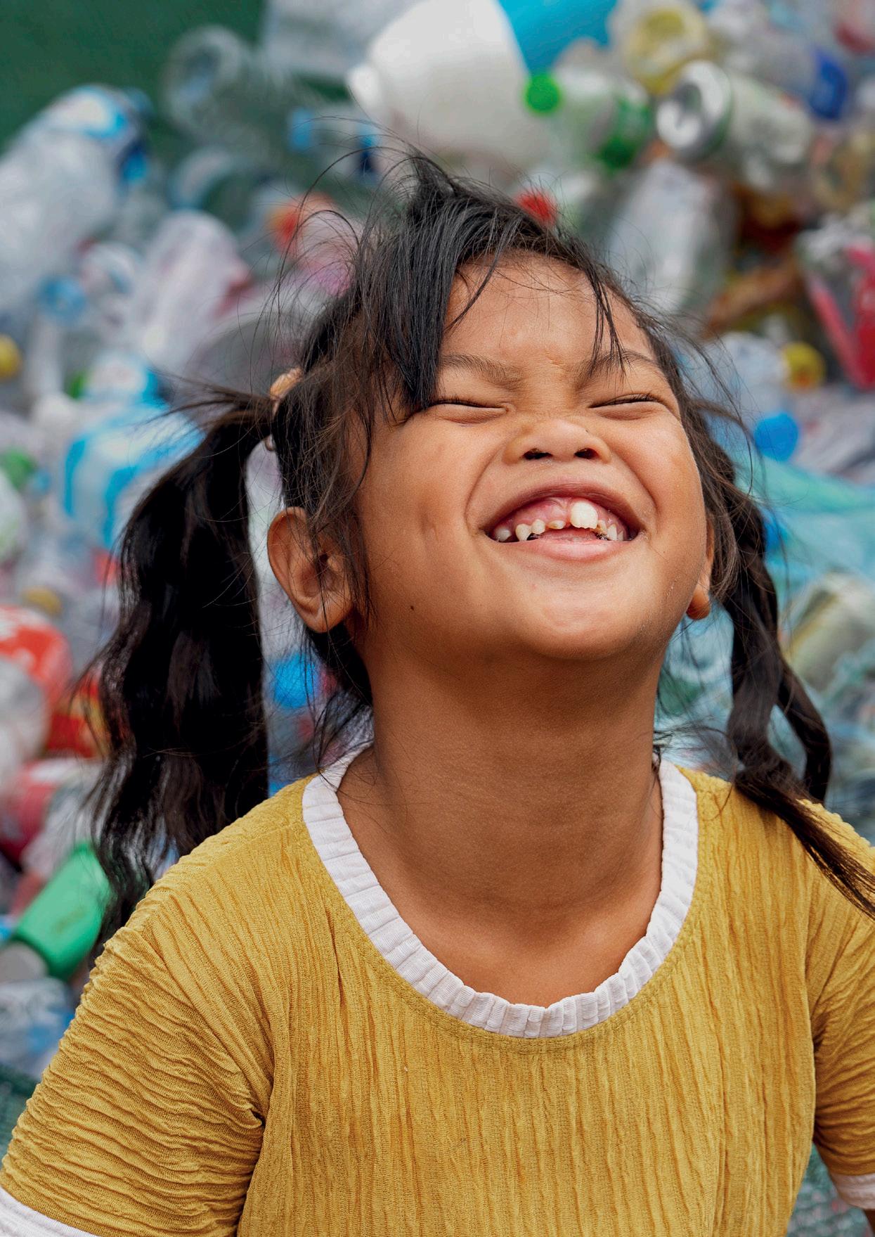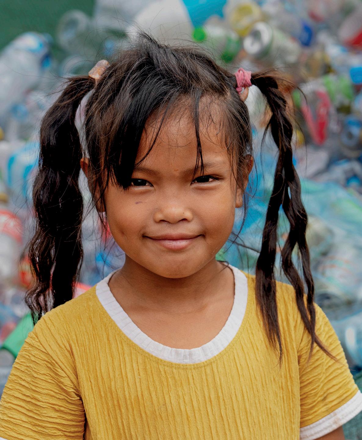 Forside og dette opslag: Pige leger i en landsby i Xaythany-distriktet i Laos. Mange familier her lever af at sortere og sælge det skrald, der dækker det meste af byens røde jord. SOS Børnebyerne støtter børn i landsbyen med skolematerialer og uniformer og underviser forældre i, at skolegang er vigtig.