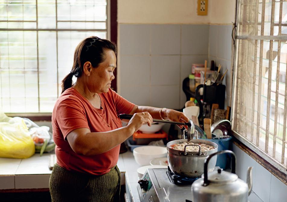 Da skolen ringer ud til frokostpause, kommer Douangchanhs børn løbende hjem. De smider taskerne i entreen og skifter skoleuniformen ud med hyggeligt hjemmetøj. Herefter begynder de ældste børn at hjælpe til med at forberede frokosten. De skærer grøntsager til den traditionelle papayasalat og steger omelet, mens Douangchanh tilbereder en suppe ved gaskomfuret. De griner og snakker sammen i køkkenet, og da maden er klar, dækker børnene bordet og sætter sig til rette for at spise.