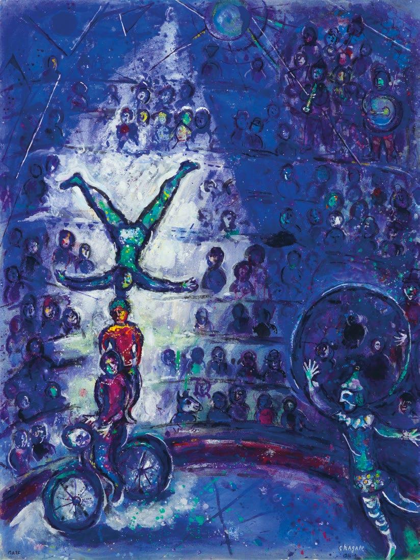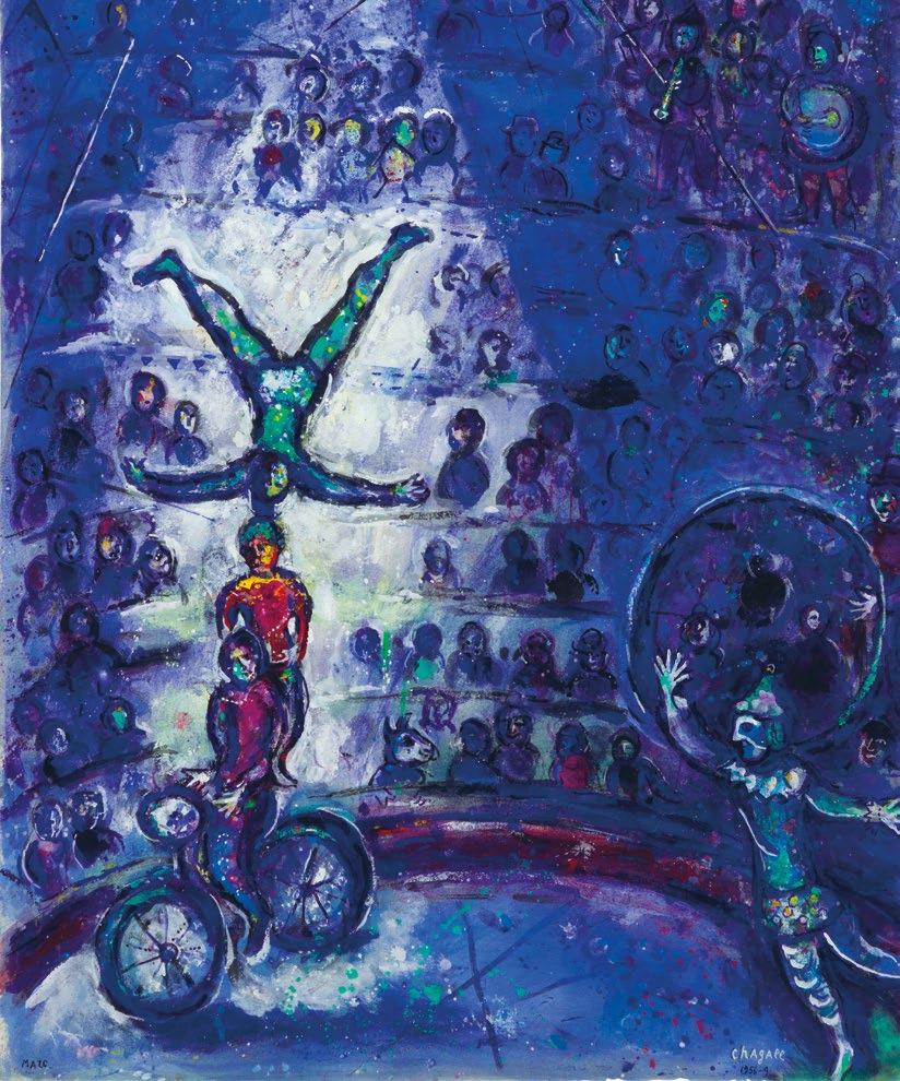 Par leurs chaudes couleurs éblouissantes, les sourires de leurs personnages qui lévitent ou s’enlacent et le joyeux onirisme de leur décor, ces trente-huit gouaches incarnent le cirque selon Chagall : l’irruption soudaine du merveilleux dans le rythme monotone de la vie quotidienne, laissant place à l’insouciance, l’amusement et la fantaisie. Perchés sur la tête ou survolant l’arène, ces gracieux acrobates défient les lois de la physique et suggèrent une certaine euphorie, révélant peut-être le bonheur que Chagall éprouve à Vence durant ces années de sa vie. La fantaisie du cirque lui permet aussi d’y introduire son célèbre univers fantastique : clowns à deux têtes, animaux anthropomorphes, personnages ailés ou amusantes chimères.