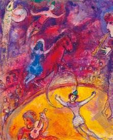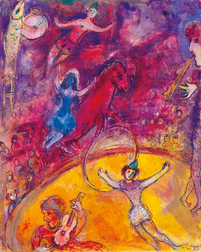 La fascination de Marc Chagall pour l’univers du cirque est merveilleusement incarnée par le cycle éponyme de trente-huit gouaches sur papier peintes vers 1957. Réalisée au faîte de sa carrière pour un livre illustré édité par Tériade en 1967, cette série signe l’aboutissement ultime de ses réflexions et de son œuvre sur ce thème, entamées dès le début de sa vie de jeune peintre. Marqué par le souvenir d’enfance des acrobates dans les rues de la ville russe de Vitebsk où il a grandi, Chagall découvre à Paris la place significative du cirque dans la peinture et la littérature françaises, notamment à travers les œuvres de Seurat et de Rouault. Il accompagne régulièrement Ambroise Vollard dans sa loge personnelle au Cirque d’Hiver, qui lui inspire une première série de gouaches en 1927, intitulée « Cirque Vollard ». En 1956, alors qu’il est invité à assister au tournage d’un film sur le cirque, il explore à nouveau ce thème à Vence dans une série de dessins préparatoires pour l’une de ses compositions majeures : Le Grand Cirque, adjugée pour 16 034 000 $ le 14 novembre 2017 chez Sotheby’s à New York. Si Vollard incite Chagall à entamer son œuvre sur le cirque, c’est Tériade qui lui permet en 1967 de l’achever. De son vrai nom Stratis Eleftheriadis, le grand éditeur grec lui propose dès 1939 d’illustrer le célèbre roman Daphnis et Chloé, puis de voyager en