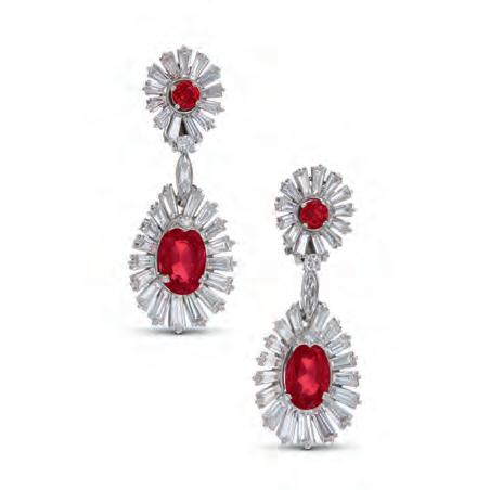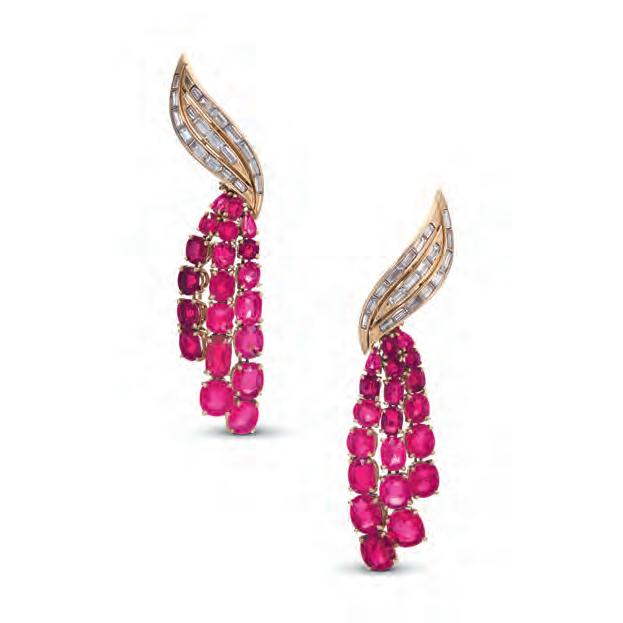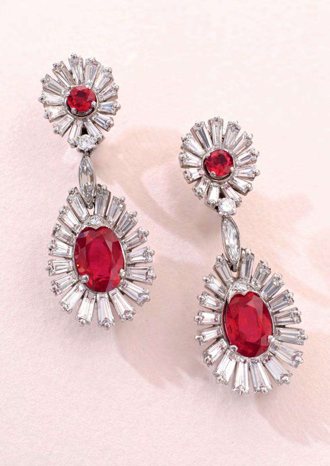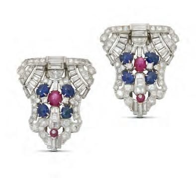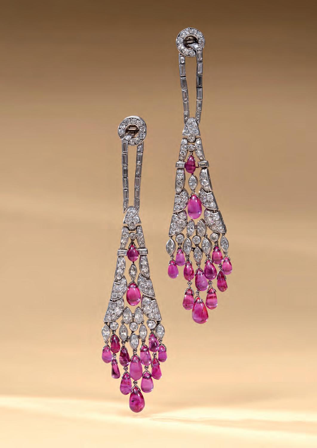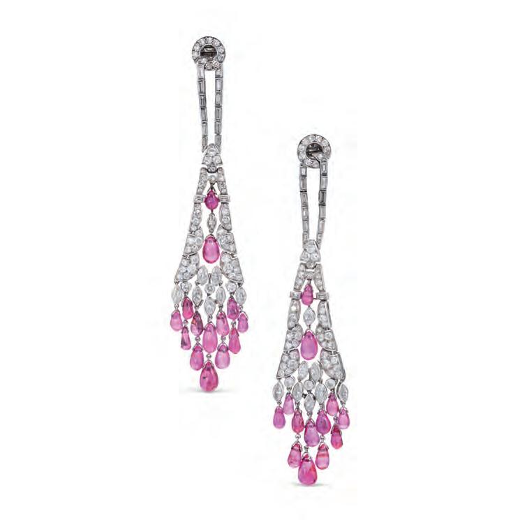 Of chandelier design, featuring dropshaped rubies within a geometric surround pavé-set with with circularand single-cut diamonds, accented by marquise-shaped and baguette diamonds, partially signed Lacloche Paris, numbered, maker’s marks for Rubel Frères, French assay marks for platinum, one small ruby and one small diamond deficient; circa 1928.