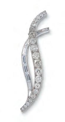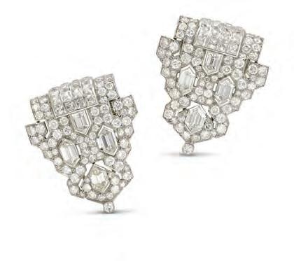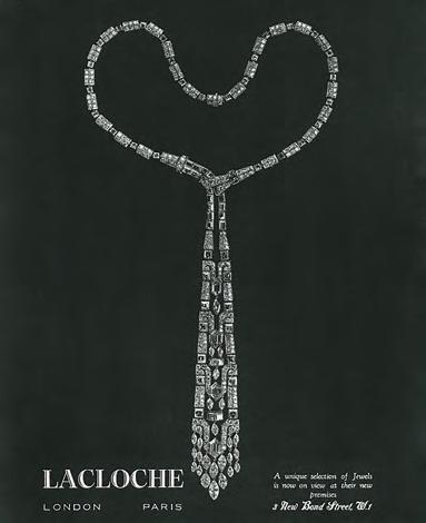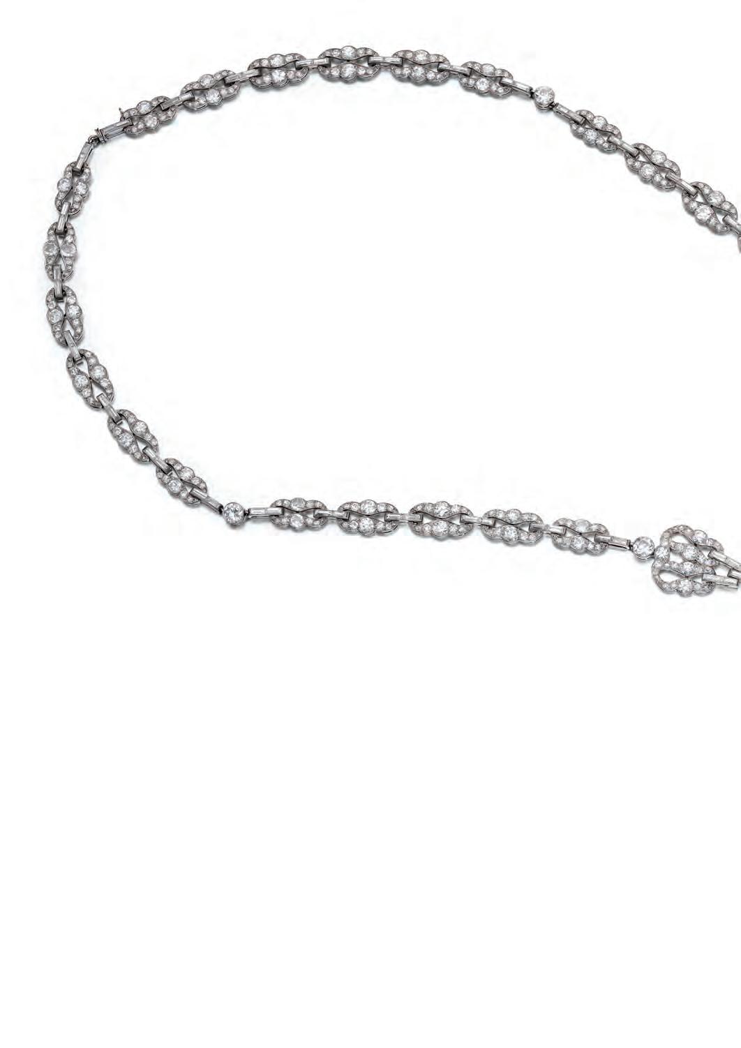 long, articulated, richly adorned shoulder brooches; the tie-necklace may be viewed, in part, as an evolution of this form. Furthermore, tie-necklaces provided ample frameworks in which to showcase the highly geometricized links and variously shaped diamonds that characterise the art deco style. Similar necklaces set throughout with diamonds or accented by emerald drops featured prominently in Lacloche Frères’ publicity illustrations of the period.