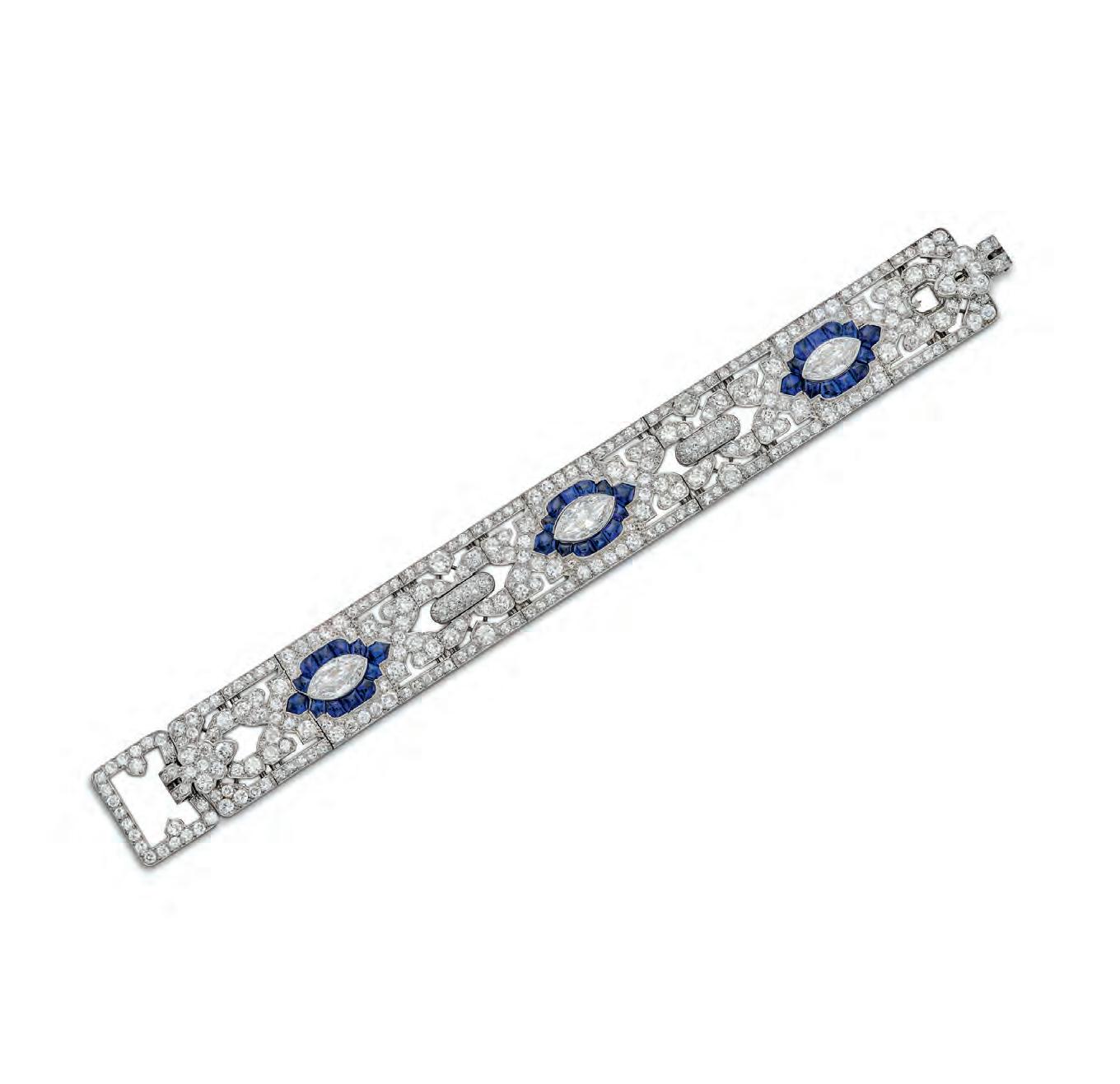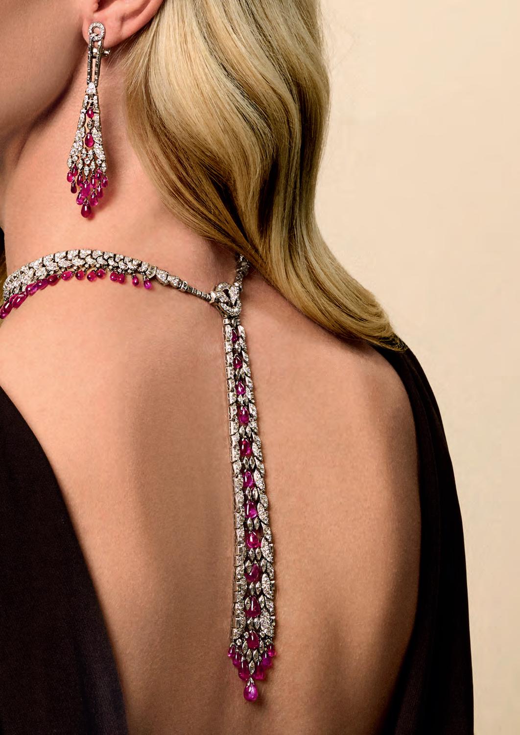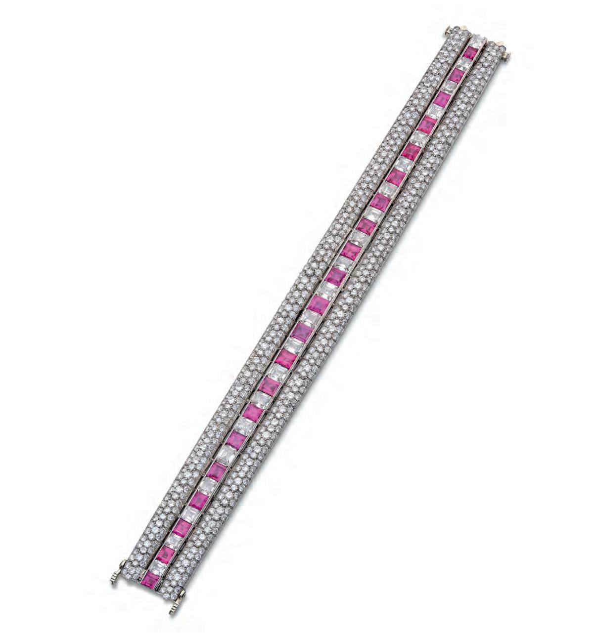 The front featuring an elongated, highly articulated tassel, set with drop-shaped rubies within a geometric surround pavé-set with with circular- and singlecut diamonds, accented by marquiseshaped and baguette diamonds, length approximately 360mm, adjustable to 340mm, detachable to be worn as a pair of bracelets with an additional clasp fitting, each length approximately 170mm, signed Lacloche Frères, maker’s marks for Rubel Frères, French assay marks for platinum; circa 1928