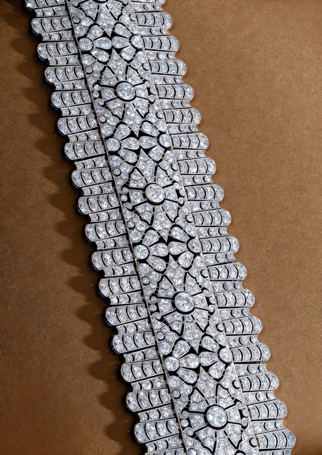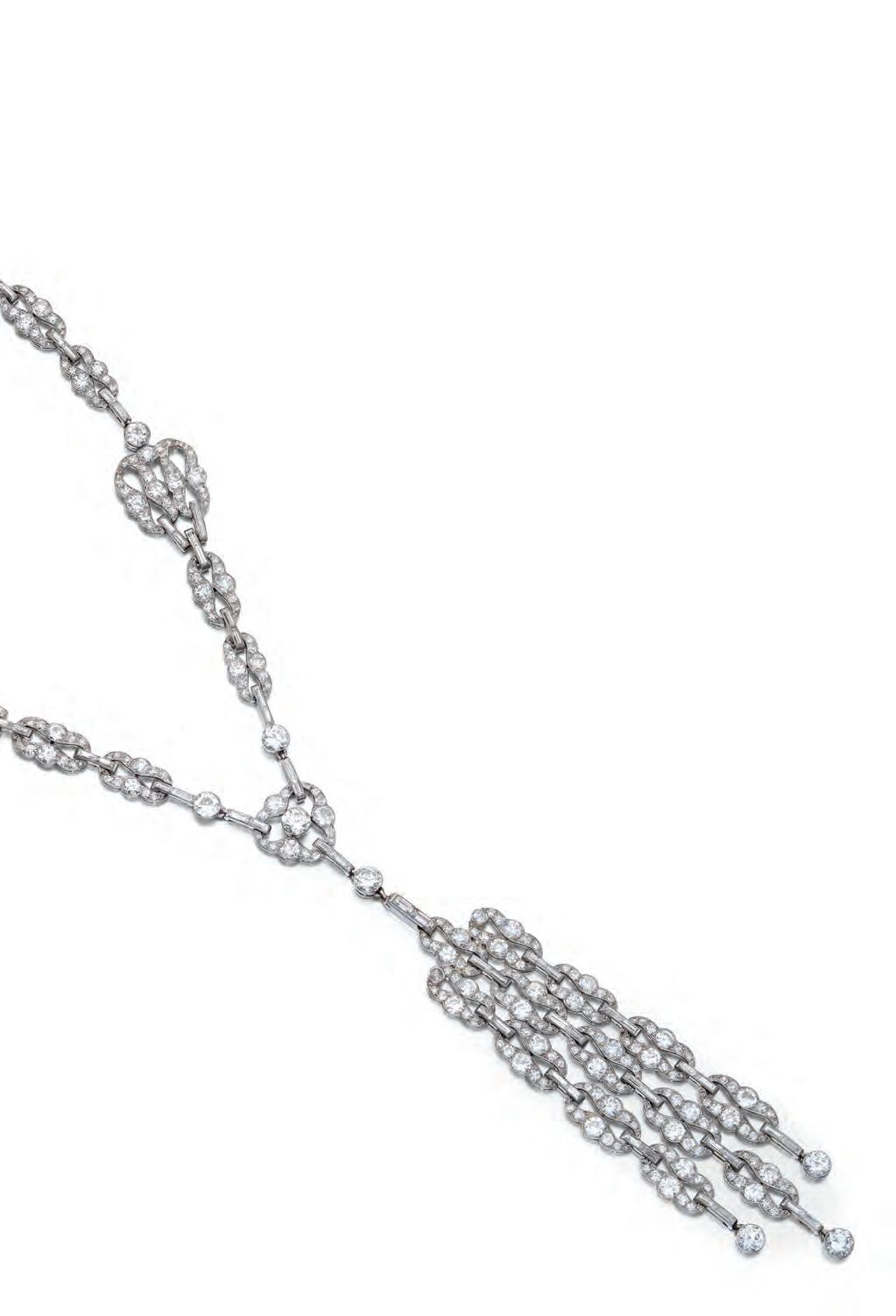 By the mid-1930s, the taste for long necklaces had given way to shorter bib styles and collars and thus the tie-necklaces seem to have been discontinued by 1935. The lavish nature of tie-necklaces was such that only a handful of examples were ever produced. As virtuosic showpieces displaying the jeweler’s art at its best, they were captured on the pages of Vogue and worn by movie stars such as Mary Pickford. It is exceedingly rare to find an intact tie-necklace and the example offered here is only the second one of its kind to come to auction in the recent times.