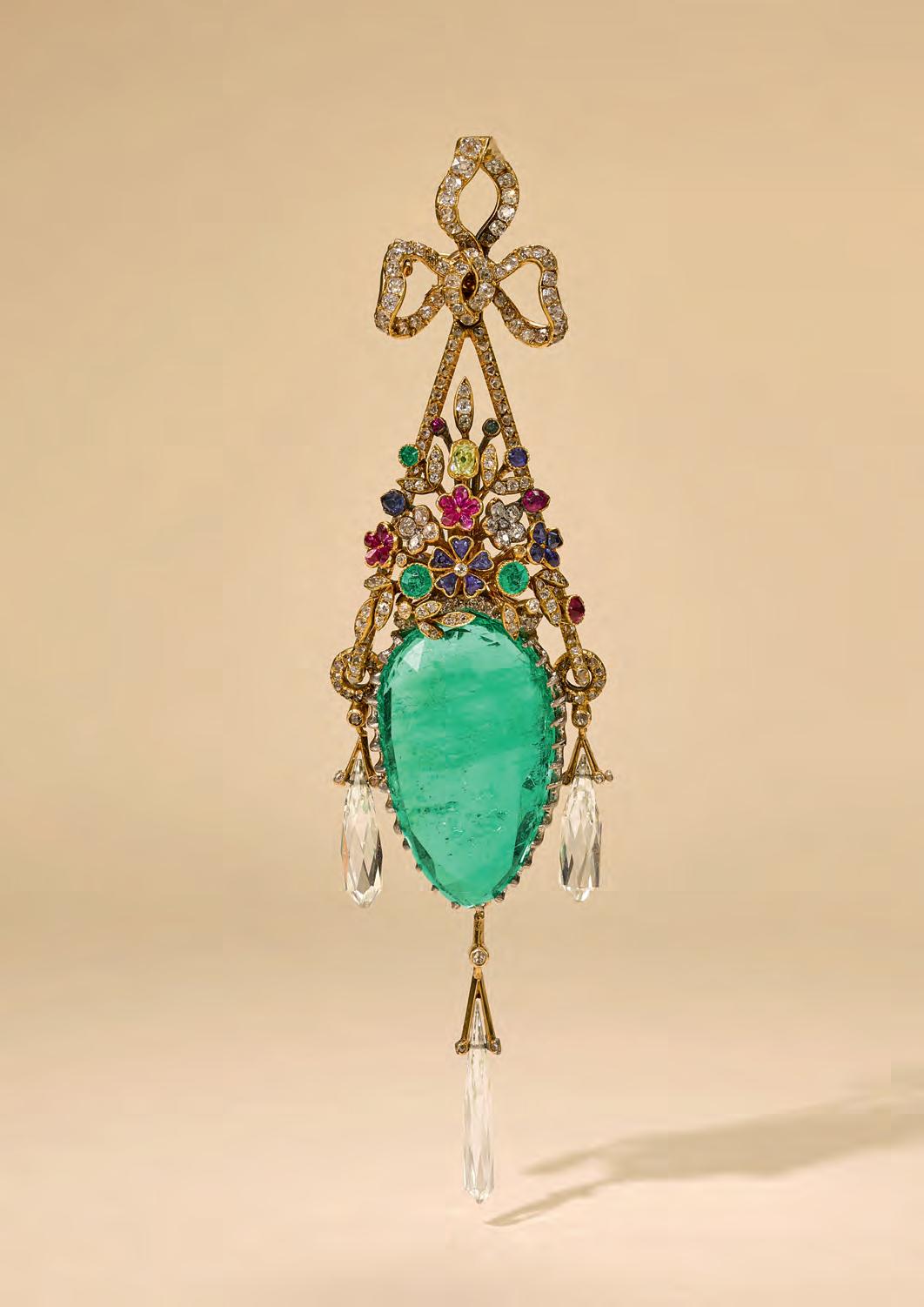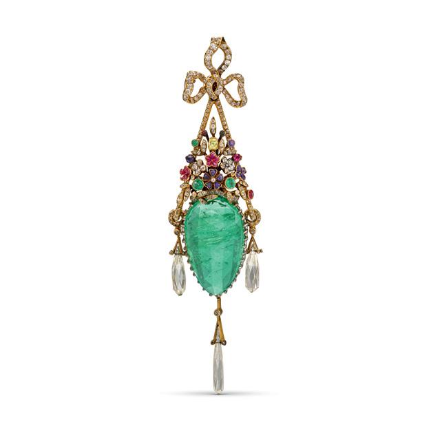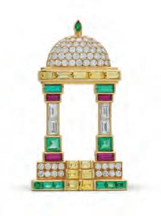 Designed as a temple, the dome and stylobate pavé-set with brilliant-cut diamonds, the entablature and stairs set with baguette diamonds of yellow tint, the columns decorated with calibrécut rubies, emeralds and baguette diamonds, topped by a collet-set pear-shaped emerald, signed Cartier, numbered, French maker’s mark and assay mark for gold; 1950s.