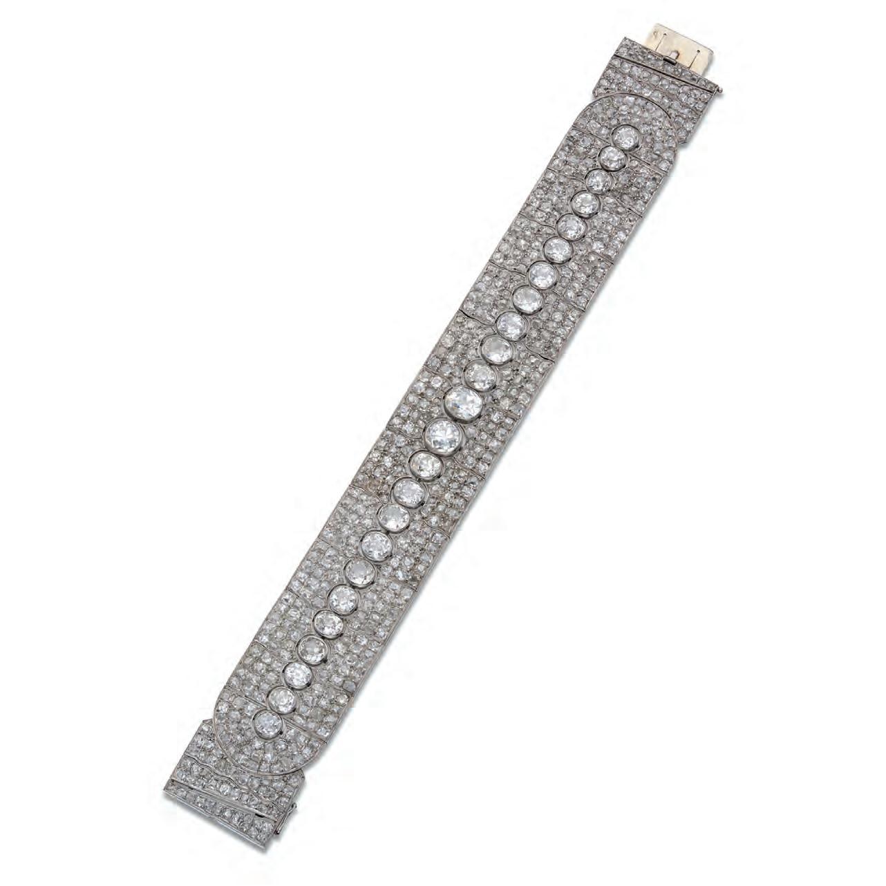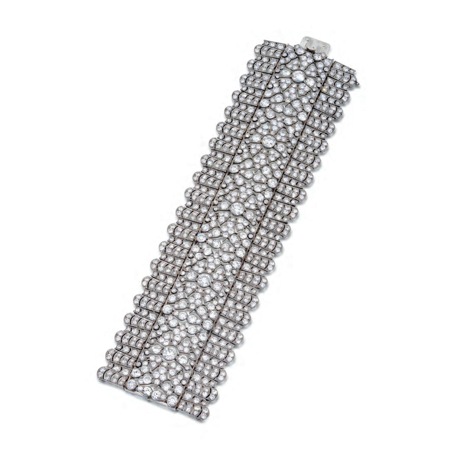 The openwork band of foliate and geometric design millegrain-set with old European- and single-cut diamonds, flanked by a similarly set articulated ruff, length approximately 190mm, unsigned, numbered, French assay marks for platinum; 1920s.