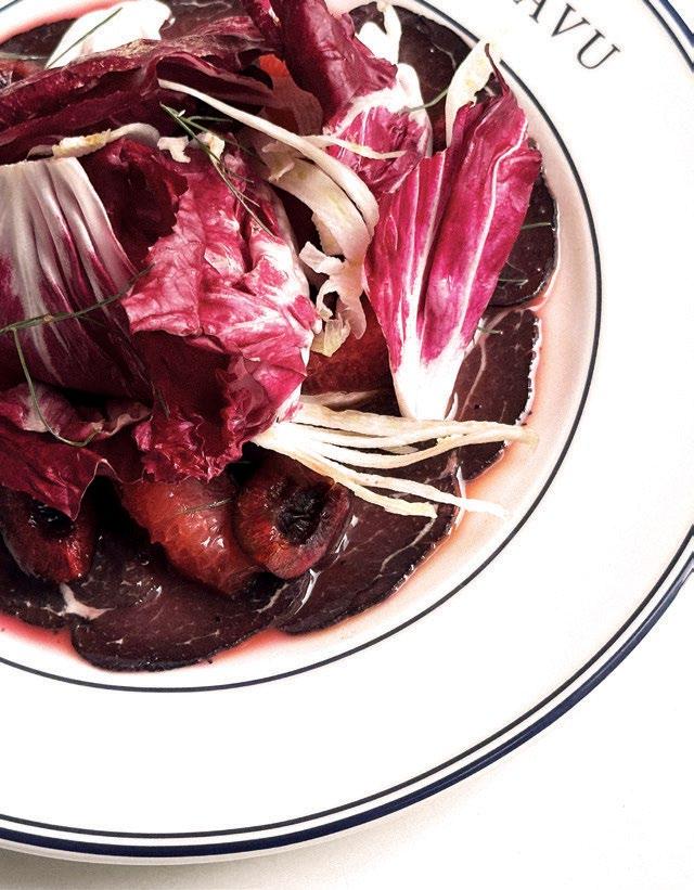 it begins with wine-cured beef that is then air-dried. “We pair it with locally sourced radicchio and grapefruit from Hunsur. Traditionally, you would add Parmesan. We didn’t want to take the cheese angle, so the dressing is made of grapefruit juice. It draws from a classic northern Italian bresaola, but everything we use is local—from the meat to the wine and the grapefruit.”