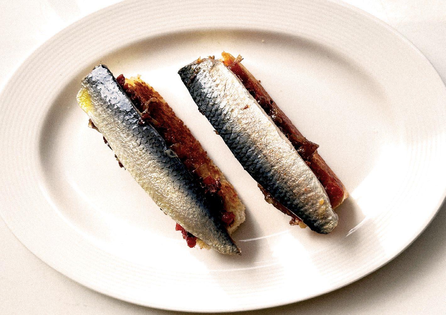 ABOVE: Pissaladière features cured sardines served on brioche soldiers with olive tapenade, caramelised onion, and tomato jam.
