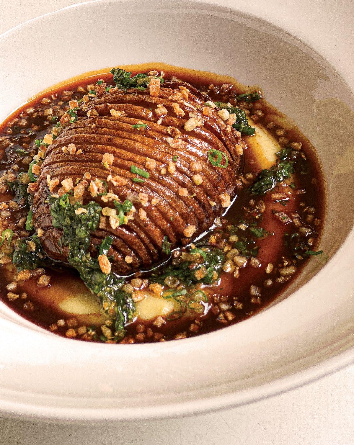 LEFT: With the open kitchen the staff and guests have a chance to interact over dishes like the Hasselback Potatoes. BELOW: The Miso Aubergine is truly a mélange of flavours and textures on the palate. BOTTOM: The Parmesan Churro is the perfect example of turning the familiar on its head.