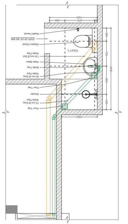 In Bathroom 3, as in is shifted to a new location, the challenge here was how to place the pipeline, after multiple options, we came up with this option which goes to the OTS via Living Room.