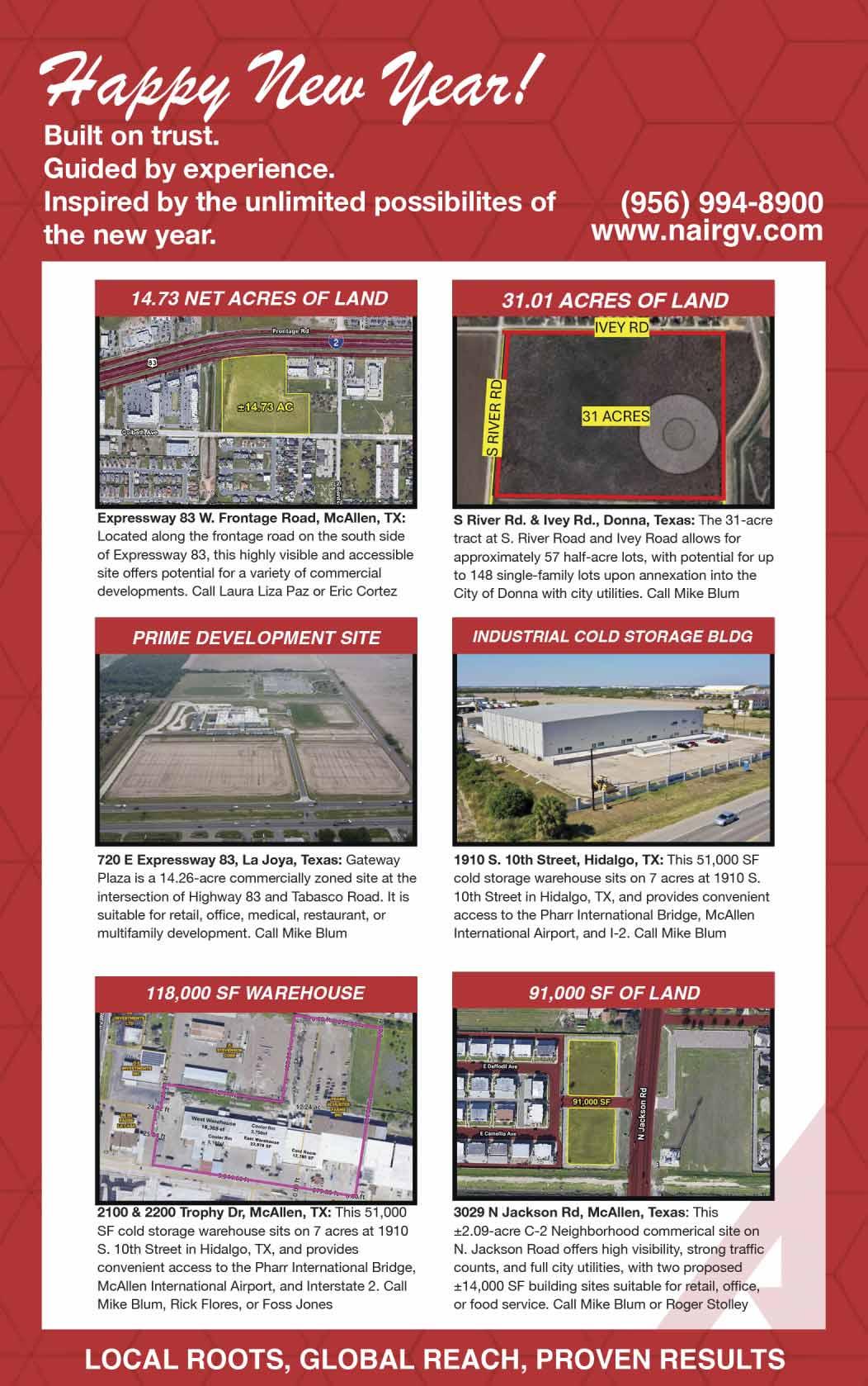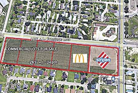COMMERCIAL PAD SITES Centrally located on South Alamo Rd. at Ridge Rd. next to Memorial High School. One-acre +/- lots next to Stripes Corner Store and McDonald's Restaurant. You can choose your lot for development today. Restrictions apply. Call Roy Rivera 956-342-1133.