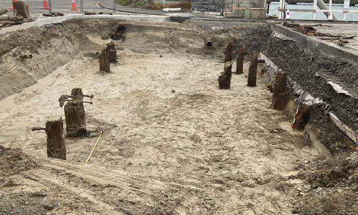 The excavation uncovered 12 historic Australian hardwood piles that were part of the original 1860ās wharf approach. The piles were starting to rot into the sand that was surrounding them from the land reclamation of the 1960ās. Once the position of the piles was recorded by the archaeologist, they were cutoff and 2 piles taken to the Bluff Maritime Museum with a view to preserve them both.