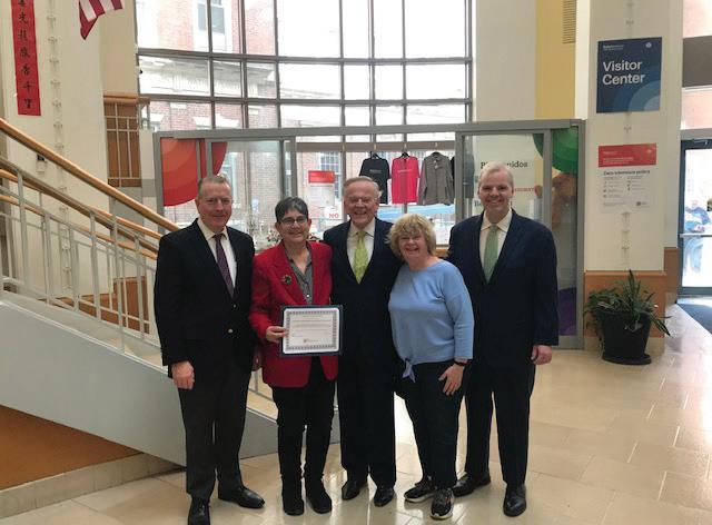 At the presentation at Tufts Medical Center, (Left to right): Charles Tevnan, of Dorchester, member of IBC New England, Sue Asci, 24-year IBC survivor, James Brett, of Dorchester, Ann Brady, of South Boston, and Rep. Sean Garballey (Arlington), presenting the certificate.