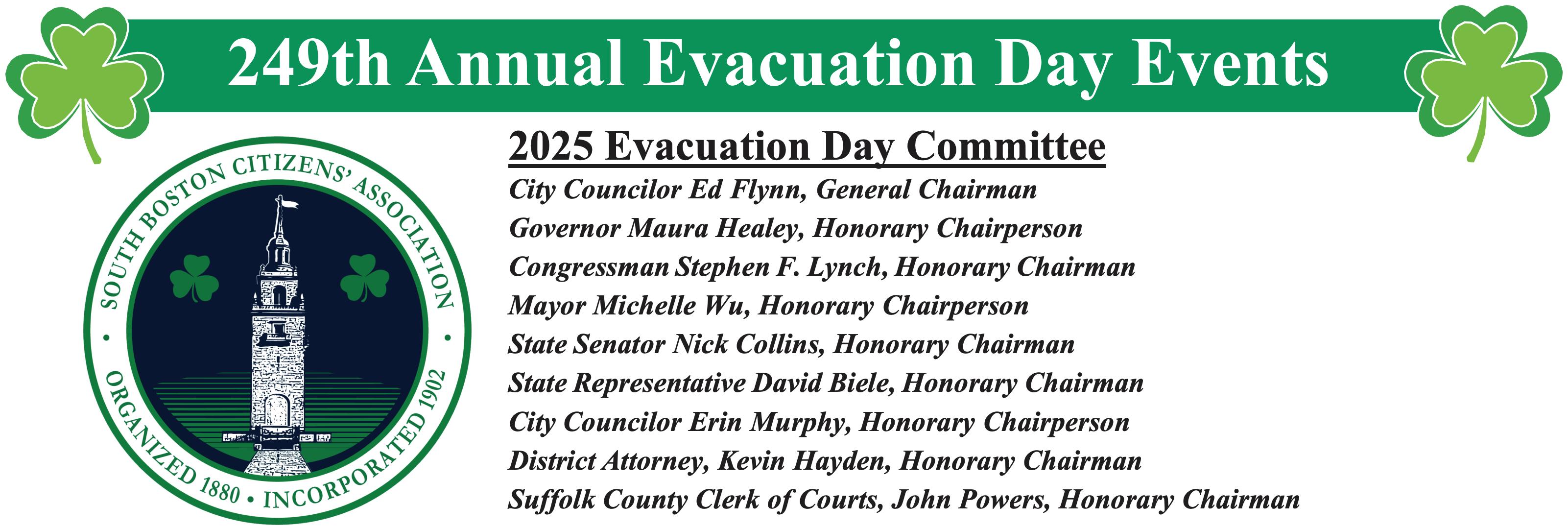 posted next week. These awards will be presented at the 145th Annual Evacuation Day Banquet to be held on March 14, 2025 at the South Boston Convention Center. Cocktail Hour is 5:30 -6:30 with Dinner being be served at 7 pm .”Entertainment will be provided by Bobby Fowkes and Curragh’s Fancy. Table of 10 is 600.00 and individual tickets are 60.00. Tickets are sure to go fast ! Please contact Tom McGrath 857-2045825 for tickets and information.