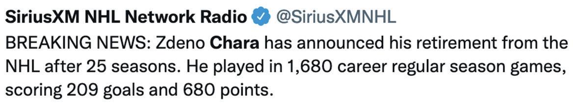 “After 25 seasons of professional hockey, 1,680 NHL regular season games, 200 Stanley Cup Playoff games, and hundreds of international games I am proud to announce my decision to retire from the National Hockey League. In doing so, I am honored to return to TD Garden to day to sign a one-day contract with the Boston Bruins and officially finish my career with the team that