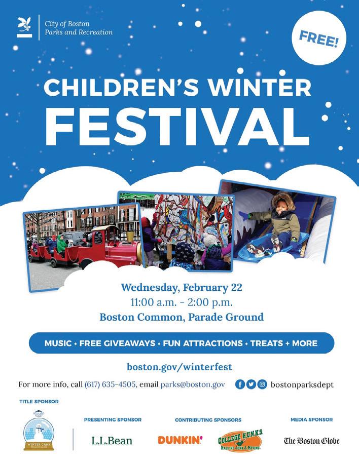 Mayor Michelle Wu and the Boston Parks and Recreation Department present the annual Children’s Winter Festival on the Boston Common Parade Ground on Wednesday, February 22, from 11 a.m. to 2 p.m. Visit boston. gov/winterfest for more information about this family-friendly school vacation week event.